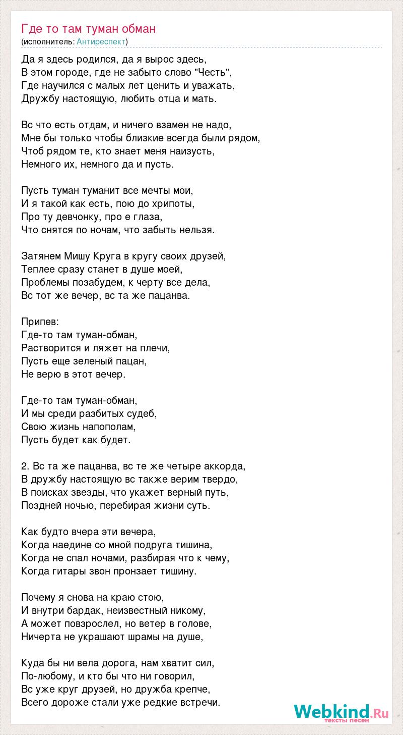 Да я здесь родился, да я вырос здесь, В этом городе, где не забыто слово "Честь", Где научился с малых лет ценить и уважать, Дружбу настоящую, любить отца и мать. Вс что есть отдам, и ничего взамен не надо, Мне бы только чтобы близкие всегда были рядом, Чтоб рядом те, кто знает меня наизусть, Немного их, немного да и пусть. Пусть туман туманит все мечты мои, И я такой как есть, пою до хрипоты, Про ту девчонку, про е глаза, Что снятся по ночам, что забыть нельзя. Затянем Мишу Круга в кругу своих друзей, Теплее сразу станет в душе моей, Проблемы позабудем, к черту все дела, Вс тот же вечер, вс та же пацанва. Припев: Где-то там туман-обман, Растворится и ляжет на плечи, Пусть еще зеленый пацан, Не верю в этот вечер. Где-то там туман-обман, И мы среди разбитых судеб, Свою жизнь напополам, Пусть будет как будет. 2. Вс та же пацанва, вс те же четыре аккорда, В дружбу настоящую вс также верим твердо, В поисках звезды, что укажет верный путь, Поздней ночью, перебирая жизни суть. Как будто вчера эти вечера, Когда наедине со мной подруга тишина, Когда не спал ночами, разбирая что к чему, Когда гитары звон пронзает тишину. Почему я снова на краю стою, И внутри бардак, неизвестный никому, А может повзрослел, но ветер в голове, Ничерта не украшают шрамы на душе, Куда бы ни вела дорога, нам хватит сил, По-любому, и кто бы что ни говорил, Вс уже круг друзей, но дружба крепче, Всего дороже стали уже редкие встречи.