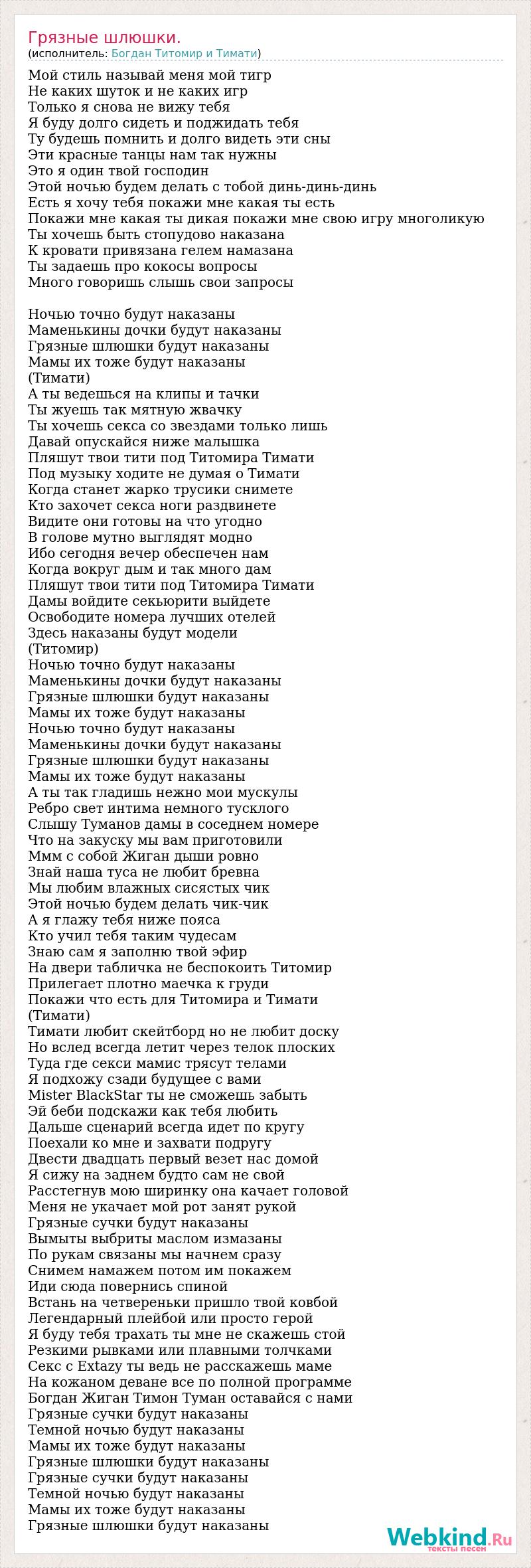 Мой стиль называй меня мой тигр Не каких шуток и не каких игр Только я снова не вижу тебя Я буду долго сидеть и поджидать тебя Ту будешь помнить и долго видеть эти сны Эти красные танцы нам так нужны Это я один твой господин Этой ночью будем делать с тобой динь-динь-динь Есть я хочу тебя покажи мне какая ты есть Покажи мне какая ты дикая покажи мне свою игру многоликую Ты хочешь быть стопудово наказана К кровати привязана гелем намазана Ты задаешь про кокосы вопросы Много говоришь слышь свои запросы Ночью точно будут наказаны Маменькины дочки будут наказаны Грязные шлюшки будут наказаны Мамы их тоже будут наказаны (Тимати) А ты ведешься на клипы и тачки Ты жуешь так мятную жвачку Ты хочешь секса со звездами только лишь Давай опускайся ниже малышка Пляшут твои тити под Титомира Тимати Под музыку ходите не думая о Тимати Когда станет жарко трусики снимете Кто захочет секса ноги раздвинете Видите они готовы на что угодно В голове мутно выглядят модно Ибо сегодня вечер обеспечен нам Когда вокруг дым и так много дам Пляшут твои тити под Титомира Тимати Дамы войдите секьюрити выйдете Освободите номера лучших отелей Здесь наказаны будут модели (Титомир) Ночью точно будут наказаны Маменькины дочки будут наказаны Грязные шлюшки будут наказаны Мамы их тоже будут наказаны Ночью точно будут наказаны Маменькины дочки будут наказаны Грязные шлюшки будут наказаны Мамы их тоже будут наказаны А ты так гладишь нежно мои мускулы Ребро свет интима немного тусклого Слышу Туманов дамы в соседнем номере Что на закуску мы вам приготовили Ммм с собой Жиган дыши ровно Знай наша туса не любит бревна Мы любим влажных сисястых чик Этой ночью будем делать чик-чик А я глажу тебя ниже пояса Кто учил тебя таким чудесам Знаю сам я заполню твой эфир На двери табличка не беспокоить Титомир Прилегает плотно маечка к груди Покажи что есть для Титомира и Тимати (Тимати) Тимати любит скейтборд но не любит доску Но вслед всегда летит через телок плоских Туда где секси мамис трясут телами Я подхожу сзади будущее с вами Mister BlackStar ты не сможешь забыть Эй беби подскажи как тебя любить Дальше сценарий всегда идет по кругу Поехали ко мне и захвати подругу Двести двадцать первый везет нас домой Я сижу на заднем будто сам не свой Расстегнув мою ширинку она качает головой Меня не укачает мой рот занят рукой Грязные сучки будут наказаны Вымыты выбриты маслом измазаны По рукам связаны мы начнем сразу Снимем намажем потом им покажем Иди сюда повернись спиной Встань на четвереньки пришло твой ковбой Легендарный плейбой или просто герой Я буду тебя трахать ты мне не скажешь стой Резкими рывками или плавными толчками Секс с Extazy ты ведь не расскажешь маме На кожаном деване все по полной программе Богдан Жиган Тимон Туман оставайся с нами Грязные сучки будут наказаны Темной ночью будут наказаны Мамы их тоже будут наказаны Грязные шлюшки будут наказаны Грязные сучки будут наказаны Темной ночью будут наказаны Мамы их тоже будут наказаны Грязные шлюшки будут наказаны