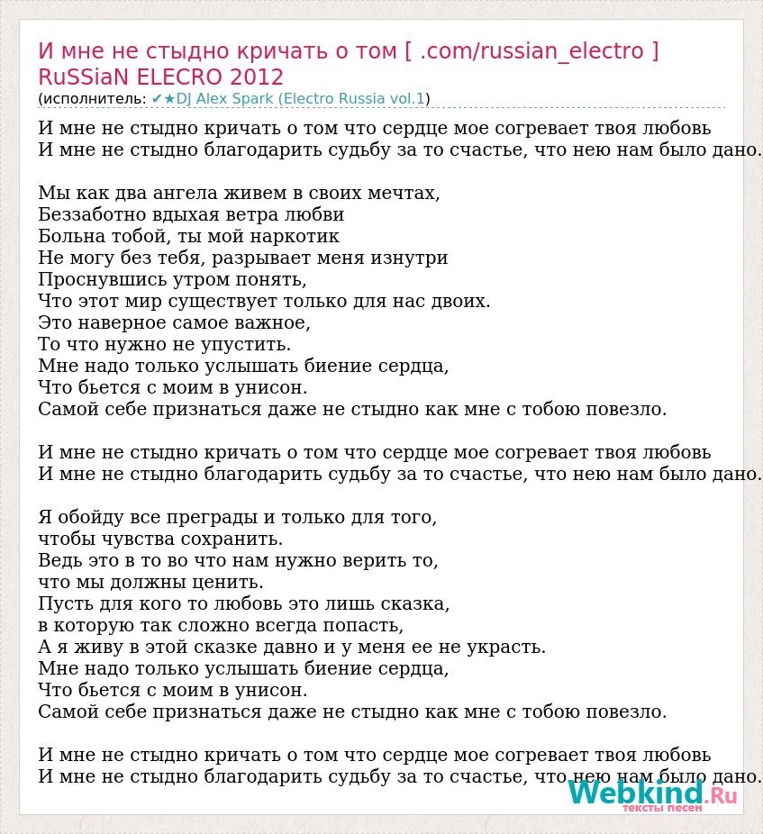 И мне не стыдно кричать о том что сердце мое согревает твоя любовь И мне не стыдно благодарить судьбу за то счастье, что нею нам было дано. Мы как два ангела живем в своих мечтах, Беззаботно вдыхая ветра любви Больна тобой, ты мой наркотик Не могу без тебя, разрывает меня изнутри Проснувшись утром понять, Что этот мир существует только для нас двоих. Это наверное самое важное, То что нужно не упустить. Мне надо только услышать биение сердца, Что бьется с моим в унисон. Самой себе признаться даже не стыдно как мне с тобою повезло. И мне не стыдно кричать о том что сердце мое согревает твоя любовь И мне не стыдно благодарить судьбу за то счастье, что нею нам было дано. Я обойду все преграды и только для того, чтобы чувства сохранить. Ведь это в то во что нам нужно верить то, что мы должны ценить. Пусть для кого то любовь это лишь сказка, в которую так сложно всегда попасть, А я живу в этой сказке давно и у меня ее не украсть. Мне надо только услышать биение сердца, Что бьется с моим в унисон. Самой себе признаться даже не стыдно как мне с тобою повезло. И мне не стыдно кричать о том что сердце мое согревает твоя любовь И мне не стыдно благодарить судьбу за то счастье, что нею нам было дано.