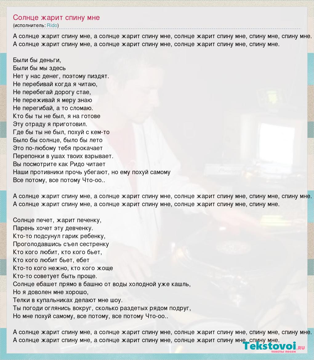 А солнце жарит спину мне, а солнце жарит спину мне, солнце жарит спину мне, спину мне, спину мне. А солнце жарит спину мне, а солнце жарит спину мне, солнце жарит спину мне, спину мне. Были бы деньги, Были бы мы здесь Нет у нас денег, поэтому пиздят. Не перебивай когда я читаю, Не перебегай дорогу стае, Не переживай я меру знаю Не перегибай, а то сломаю. Кто бы ты не был, я на готове Эту отраду я приготовил. Где бы ты не был, похуй с кем-то Было бы солнце, было бы лето Это по-любому тебя прокачает Перепонки в ушах твоих взрывает. Вы посмотрите как Ридо читает Наши противники прочь убегают, но ему похуй самому Все потому, все потому Что-оо.. А солнце жарит спину мне, а солнце жарит спину мне, солнце жарит спину мне, спину мне, спину мне. А солнце жарит спину мне, а солнце жарит спину мне, солнце жарит спину мне, спину мне. Солнце печет, жарит печенку, Парень хочет эту девченку. Кто-то подсунул гарик ребенку, Проголодавшись съел сестренку Кто кого любит, кто кого бьет, Кто кого любит бьет, ебет Кто-то кого нежно, кто кого жоще Кто-то советует быть проще. Солнце ебашет прямо в башню от воды холодной уже кашль, Но я доволен мне хорошо, Телки в купальниках делают мне шоу. Ты погоди оглянись вокруг, сколько раздетых рядом подруг, Но мне похуй самому, все потому, все потому Что-оо.. А солнце жарит спину мне, а солнце жарит спину мне, солнце жарит спину мне, спину мне, спину мне. А солнце жарит спину мне, а солнце жарит спину мне, солнце жарит спину мне, спину мне.