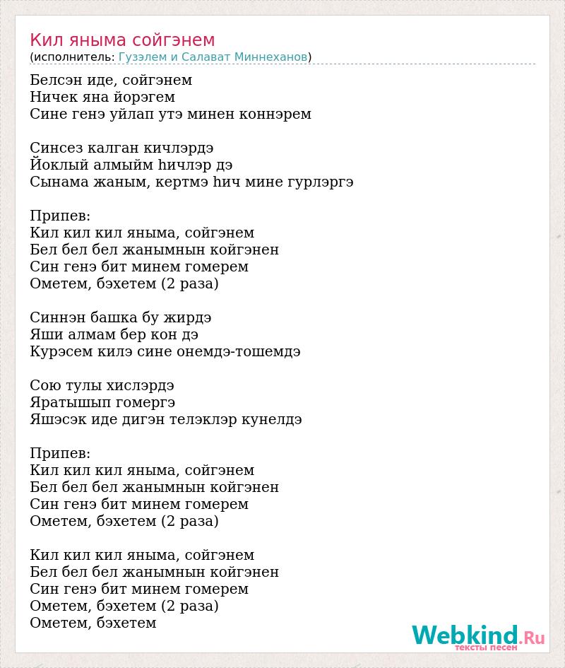 Белсэн иде, сойгэнем Ничек яна йорэгем Сине генэ уйлап утэ минен коннэрем Синсез калган кичлэрдэ Йоклый алмыйм hичлэр дэ Сынама жаным, кертмэ hич мине гурлэргэ Припев: Кил кил кил яныма, сойгэнем Бел бел бел жанымнын койгэнен Син генэ бит минем гомерем Ометем, бэхетем (2 раза) Синнэн башка бу жирдэ Яши алмам бер кон дэ Курэсем килэ сине онемдэ-тошемдэ Сою тулы хислэрдэ Яратышып гомергэ Яшэсэк иде дигэн телэклэр кунелдэ Припев: Кил кил кил яныма, сойгэнем Бел бел бел жанымнын койгэнен Син генэ бит минем гомерем Ометем, бэхетем (2 раза) Кил кил кил яныма, сойгэнем Бел бел бел жанымнын койгэнен Син генэ бит минем гомерем Ометем, бэхетем (2 раза) Ометем, бэхетем
