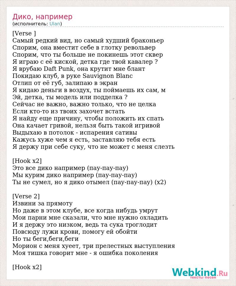 [Verse ] Самый редкий вид, но самый худший браконьер Спорим, она вместит себе в глотку револьвер Спорим, что ты больше не покинешь этот сквер Я играю с её киской, детка где твой кавалер ? Я врубаю Daft Punk, она крутит мне блант Покидаю клуб, в руке Sauvignon Blanc Отлип от её губ, залипаю в экран Я кидаю деньги в воздух, ты поймаешь их сам, м Эй, детка, ты модель или подделка ? Сейчас не важно, важно только, что не целка Если кто-то из твоих захочет встать Я найду еще причину, чтобы положить их спать Она качает гривой, нельзя быть такой игривой Выдыхаю в потолок - испарения сативы Кажусь хуже чем я есть, заставляю тебя есть Я держу при себе суку, что не может с меня слезть [Hook x2] Это все дико например (пау-пау-пау) Мы курим дико например (пау-пау-пау) Ты не сумел, но я дико отымел (пау-пау-пау) (x2) [Verse 2] Извини за прямоту Но даже в этом клубе, все когда нибудь умрут Мои парни мне сказали, что мне нужно охладить И я держу это низком, ведь та сука троглодит Повсюду лужи крови, помогу ей обойти Но ты беги,беги,беги Морион с меня хуеет, три прелестных выступления Моя тишка говорит мне - я ошибка поколения [Hook x2]