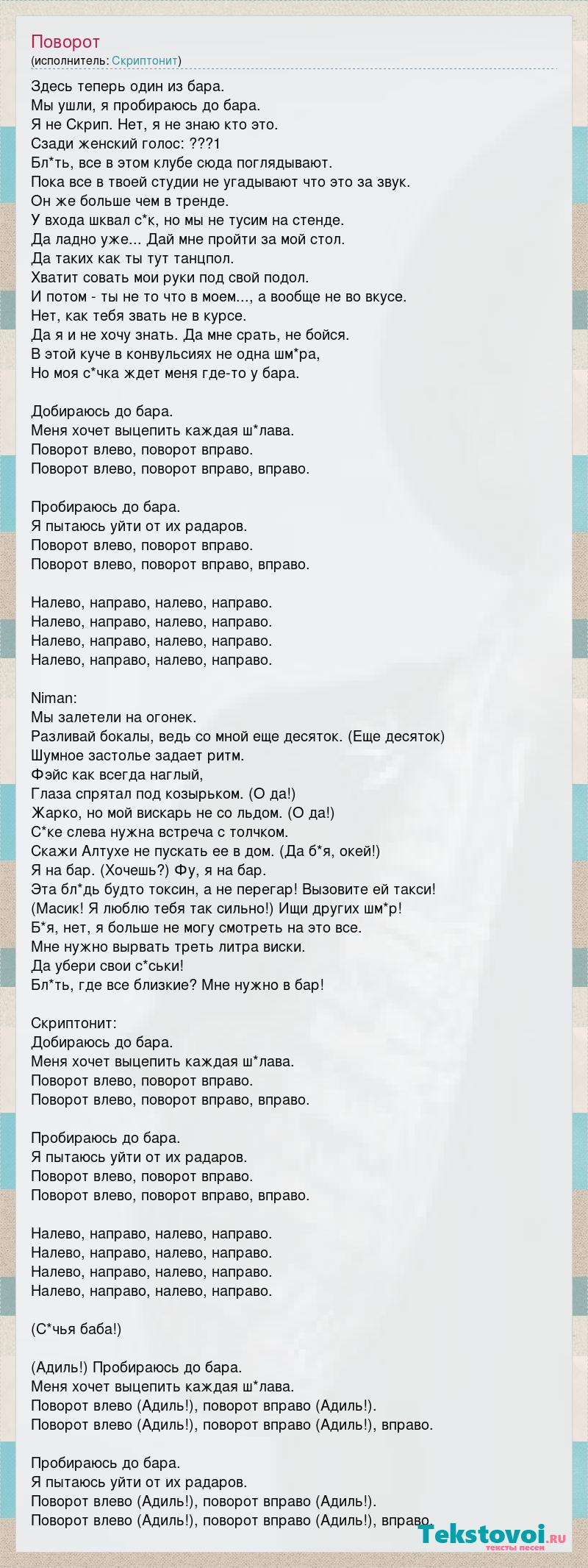 Здесь теперь один из бара. Мы ушли, я пробираюсь до бара. Я не Скрип. Нет, я не знаю кто это. Сзади женский голос: ???1 Бл*ть, все в этом клубе сюда поглядывают. Пока все в твоей студии не угадывают что это за звук. Он же больше чем в тренде. У входа шквал с*к, но мы не тусим на стенде. Да ладно уже... Дай мне пройти за мой стол. Да таких как ты тут танцпол. Хватит совать мои руки под свой подол. И потом - ты не то что в моем..., а вообще не во вкусе. Нет, как тебя звать не в курсе. Да я и не хочу знать. Да мне срать, не бойся. В этой куче в конвульсиях не одна шм*ра, Но моя с*чка ждет меня где-то у бара. Добираюсь до бара. Меня хочет выцепить каждая ш*лава. Поворот влево, поворот вправо. Поворот влево, поворот вправо, вправо. Пробираюсь до бара. Я пытаюсь уйти от их радаров. Поворот влево, поворот вправо. Поворот влево, поворот вправо, вправо. Налево, направо, налево, направо. Налево, направо, налево, направо. Налево, направо, налево, направо. Налево, направо, налево, направо. Niman: Мы залетели на огонек. Разливай бокалы, ведь со мной еще десяток. (Еще десяток) Шумное застолье задает ритм. Фэйс как всегда наглый, Глаза спрятал под козырьком. (О да!) Жарко, но мой вискарь не со льдом. (О да!) С*ке слева нужна встреча с толчком. Скажи Алтухе не пускать ее в дом. (Да б*я, окей!) Я на бар. (Хочешь?) Фу, я на бар. Эта бл*дь будто токсин, а не перегар! Вызовите ей такси! (Масик! Я люблю тебя так сильно!) Ищи других шм*р! Б*я, нет, я больше не могу смотреть на это все. Мне нужно вырвать треть литра виски. Да убери свои с*ськи! Бл*ть, где все близкие? Мне нужно в бар! Скриптонит: Добираюсь до бара. Меня хочет выцепить каждая ш*лава. Поворот влево, поворот вправо. Поворот влево, поворот вправо, вправо. Пробираюсь до бара. Я пытаюсь уйти от их радаров. Поворот влево, поворот вправо. Поворот влево, поворот вправо, вправо. Налево, направо, налево, направо. Налево, направо, налево, направо. Налево, направо, налево, направо. Налево, направо, налево, направо. (С*чья баба!) (Адиль!) Пробираюсь до бара. Меня хочет выцепить каждая ш*лава. Поворот влево (Адиль!), поворот вправо (Адиль!). Поворот влево (Адиль!), поворот вправо (Адиль!), вправо. Пробираюсь до бара. Я пытаюсь уйти от их радаров. Поворот влево (Адиль!), поворот вправо (Адиль!). Поворот влево (Адиль!), поворот вправо (Адиль!), вправо.