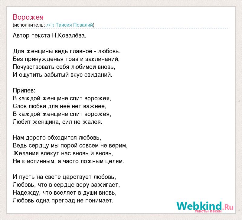 Автор текста Н.Ковалёва. Для женщины ведь главное - любовь. Без принужденья трав и заклинаний, Почувствовать себя любимой вновь, И ощутить забытый вкус свиданий. Припев: В каждой женщине спит ворожея, Слов любви для неё нет важнее, В каждой женщине спит ворожея, Любит женщина, сил не жалея. Нам дорого обходится любовь, Ведь сердцу мы порой совсем не верим, Желания влекут нас вновь и вновь, Не к истинным, а часто ложным целям. И пусть на свете царствует любовь, Любовь, что в сердце веру зажигает, Надежду, что вселяет в души вновь, Любовь одна преград не понимает.