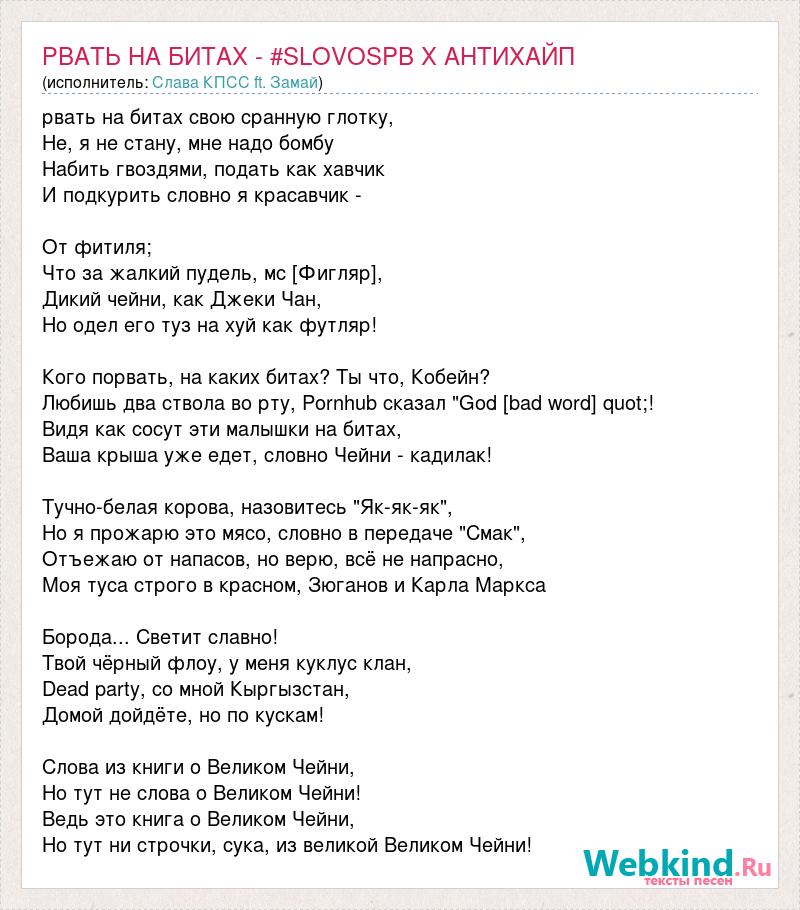 рвать на битах свою сранную глотку, Не, я не стану, мне надо бомбу Набить гвоздями, подать как хавчик И подкурить словно я красавчик - От фитиля; Что за жалкий пудель, мс [Фигляр], Дикий чейни, как Джеки Чан, Но одел его туз на хуй как футляр! Кого порвать, на каких битах? Ты что, Кобейн? Любишь два ствола во рту, Pornhub сказал "God [bad word] quot;! Видя как сосут эти малышки на битах, Ваша крыша уже едет, словно Чейни - кадилак! Тучно-белая корова, назовитесь "Як-як-як", Но я прожарю это мясо, словно в передаче "Смак", Отъежаю от напасов, но верю, всё не напрасно, Моя туса строго в красном, Зюганов и Карла Маркса Борода... Светит славно! Твой чёрный флоу, у меня куклус клан, Dead party, со мной Кыргызстан, Домой дойдёте, но по кускам! Слова из книги о Великом Чейни, Но тут не слова о Великом Чейни! Ведь это книга о Великом Чейни, Но тут ни строчки, сука, из великой Великом Чейни!