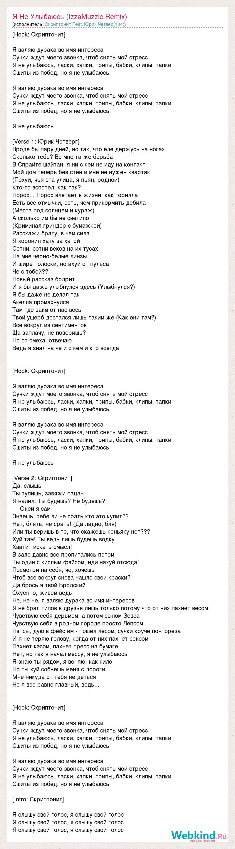 [Hook: Скриптонит] Я валяю дурака во имя интереса Сучки ждут моего звонка, чтоб снять мой стресс Я не улыбаюсь, ласки, хапки, трипы, бабки, клипы, тапки Сшиты из побед, но я не улыбаюсь Я валяю дурака во имя интереса Сучки ждут моего звонка, чтоб снять мой стресс Я не улыбаюсь, ласки, хапки, трипы, бабки, клипы, тапки Сшиты из побед, но я не улыбаюсь Я не улыбаюсь [Verse 1: Юрик Четверг] Вроде бы пару дней, но так, что еле держусь на ногах Сколько тебе? Во мне та же борьба В Спрайте шайтан, я ни с кем не иду на контакт Мой дом теперь без стен и мне не нужен квартак (Похуй, чья эта улица, я пьян, родной) Кто-то вспотел, как так? Порох... Порох влетает в жизни, как горилла Есть все отмычки, есть, чем прикормить дебила (Места под солнцем и кураж) А сколько им бы не светило (Криминал гриндер с бумажкой) Расскажи брату, в чем сила Я хоронил хату за хатой Сотни, сотни веков на их тусах На мне черно-белые линзы И шире полоски, но ахуй от пульса Че с тобой?? Новый рассказ бодрит И я бы даже улыбнулся здесь (Улыбнулся?) Я бы даже не делал так Акелла промахнулся Там где закм от нас весь Твой ущерб достался лишь таким же (Как они там?) Все вокруг из сентиментов Ща заплачу, не поверишь? Но от смеха, отвечаю Ведь я знал на че и с кем и кто всегда [Hook: Скриптонит] Я валяю дурака во имя интереса Сучки ждут моего звонка, чтоб снять мой стресс Я не улыбаюсь, ласки, хапки, трипы, бабки, клипы, тапки Сшиты из побед, но я не улыбаюсь Я валяю дурака во имя интереса Сучки ждут моего звонка, чтоб снять мой стресс Я не улыбаюсь, ласки, хапки, трипы, бабки, клипы, тапки Сшиты из побед, но я не улыбаюсь Я не улыбаюсь [Verse 2: Скриптонит] Да, слышь Ты тупишь, завяжи пацан Я налил. Ты будешь? Не будешь?! — Окей я сам Знаешь, тебе ли не срать кто это купит?? Нет, блять, не срать! (Да ладно, бля) Или ты веришь в то, что скажешь коньяку нет??? Хуй там! Ты ведь лишь будешь водку Хватит искать смысл! В зале давно все пропитались потом Ты один с кислым фэйсом, иди нахуй отсюда! Посмотри на себя, че, хочешь Чтоб все вокруг снова нашло свои краски? Да брось я твой Бродский Охуенно, живем ведь Не, не не, я валяю дурака во имя интересов Я не брал типов в друзья лишь только потому что от них пахнет весом Чувствую себя дерьмом, а потом сыном Зевса Чувствую себя в родном городе просто Лепсом Пэпсы, дую в фейс им - пошел лесом, сучки круче понтореза И я не теряю голову, когда от них пахнет сексом Пахнет кэсом, пахнет пресс на бумаге Нет, но так я начал мессу, я не улыбаюсь Я знаю ты рядом, я воняю, как кило Но ты хуй собьешь меня с дороги Мне никуда от тебя не деться Но я все равно главный, ведь... [Hook: Скриптонит] Я валяю дурака во имя интереса Сучки ждут моего звонка, чтоб снять мой стресс Я не улыбаюсь, ласки, хапки, трипы, бабки, клипы, тапки Сшиты из побед, но я не улыбаюсь Я валяю дурака во имя интереса Сучки ждут моего звонка, чтоб снять мой стресс Я не улыбаюсь, ласки, хапки, трипы, бабки, клипы, тапки Сшиты из побед, но я не улыбаюсь [Intro: Скриптонит] Я слышу свой голос, я слышу свой голос Я слышу свой голос, я слышу свой голос Я слышу свой голос, я слышу свой голос