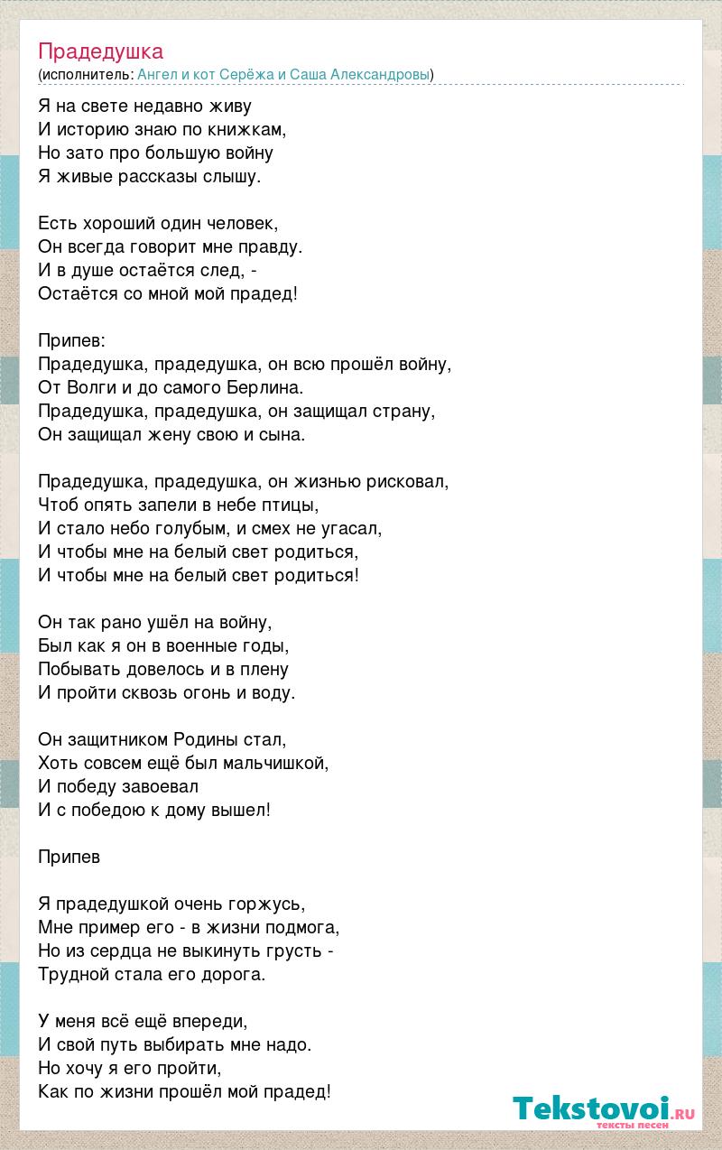 Я на свете недавно живу И историю знаю по книжкам, Но зато про большую войну Я живые рассказы слышу. Есть хороший один человек, Он всегда говорит мне правду. И в душе остаётся след, - Остаётся со мной мой прадед! Припев: Прадедушка, прадедушка, он всю прошёл войну, От Волги и до самого Берлина. Прадедушка, прадедушка, он защищал страну, Он защищал жену свою и сына. Прадедушка, прадедушка, он жизнью рисковал, Чтоб опять запели в небе птицы, И стало небо голубым, и смех не угасал, И чтобы мне на белый свет родиться, И чтобы мне на белый свет родиться! Он так рано ушёл на войну, Был как я он в военные годы, Побывать довелось и в плену И пройти сквозь огонь и воду. Он защитником Родины стал, Хоть совсем ещё был мальчишкой, И победу завоевал И с победою к дому вышел! Припев Я прадедушкой очень горжусь, Мне пример его - в жизни подмога, Но из сердца не выкинуть грусть - Трудной стала его дорога. У меня всё ещё впереди, И свой путь выбирать мне надо. Но хочу я его пройти, Как по жизни прошёл мой прадед!