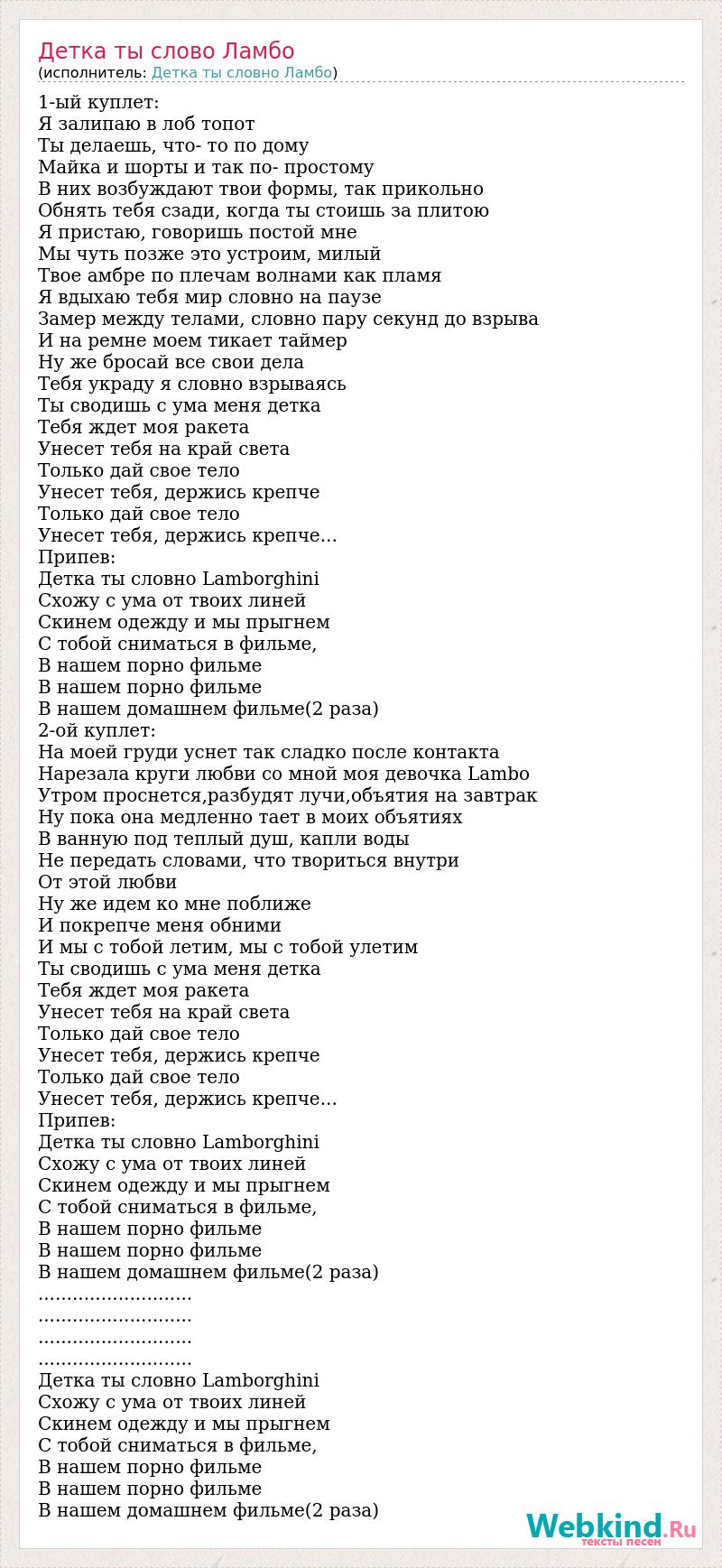 1-ый куплет: Я залипаю в лоб топот Ты делаешь, что- то по дому Майка и шорты и так по- простому В них возбуждают твои формы, так прикольно Обнять тебя сзади, когда ты стоишь за плитою Я пристаю, говоришь постой мне Мы чуть позже это устроим, милый Твое амбре по плечам волнами как пламя Я вдыхаю тебя мир словно на паузе Замер между телами, словно пару секунд до взрыва И на ремне моем тикает таймер Ну же бросай все свои дела Тебя украду я словно взрываясь Ты сводишь с ума меня детка Тебя ждет моя ракета Унесет тебя на край света Только дай свое тело Унесет тебя, держись крепче Только дай свое тело Унесет тебя, держись крепче... Припев: Детка ты словно Lamborghini Схожу с ума от твоих линей Скинем одежду и мы прыгнем С тобой сниматься в фильме, В нашем порно фильме В нашем порно фильме В нашем домашнем фильме(2 раза) 2-ой куплет: На моей груди уснет так сладко после контакта Нарезала круги любви со мной моя девочка Lambo Утром проснется,разбудят лучи,объятия на завтрак Ну пока она медленно тает в моих объятиях В ванную под теплый душ, капли воды Не передать словами, что твориться внутри От этой любви Ну же идем ко мне поближе И покрепче меня обними И мы с тобой летим, мы с тобой улетим Ты сводишь с ума меня детка Тебя ждет моя ракета Унесет тебя на край света Только дай свое тело Унесет тебя, держись крепче Только дай свое тело Унесет тебя, держись крепче... Припев: Детка ты словно Lamborghini Схожу с ума от твоих линей Скинем одежду и мы прыгнем С тобой сниматься в фильме, В нашем порно фильме В нашем порно фильме В нашем домашнем фильме(2 раза) ........................... ........................... ........................... ........................... Детка ты словно Lamborghini Схожу с ума от твоих линей Скинем одежду и мы прыгнем С тобой сниматься в фильме, В нашем порно фильме В нашем порно фильме В нашем домашнем фильме(2 раза)