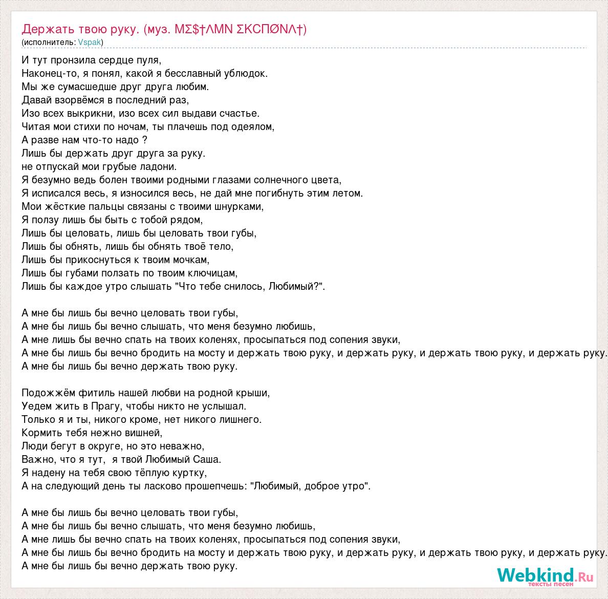 И тут пронзила сердце пуля, Наконец-то, я понял, какой я бесславный ублюдок. Мы же сумасшедше друг друга любим. Давай взорвёмся в последний раз, Изо всех выкрикни, изо всех сил выдави счастье. Читая мои стихи по ночам, ты плачешь под одеялом, А разве нам что-то надо ? Лишь бы держать друг друга за руку. не отпускай мои грубые ладони. Я безумно ведь болен твоими родными глазами солнечного цвета, Я исписался весь, я износился весь, не дай мне погибнуть этим летом. Мои жёсткие пальцы связаны с твоими шнурками, Я ползу лишь бы быть с тобой рядом, Лишь бы целовать, лишь бы целовать твои губы, Лишь бы обнять, лишь бы обнять твоё тело, Лишь бы прикоснуться к твоим мочкам, Лишь бы губами ползать по твоим ключицам, Лишь бы каждое утро слышать "Что тебе снилось, Любимый?". А мне бы лишь бы вечно целовать твои губы, А мне бы лишь бы вечно слышать, что меня безумно любишь, А мне лишь бы вечно спать на твоих коленях, просыпаться под сопения звуки, А мне бы лишь бы вечно бродить на мосту и держать твою руку, и держать руку, и держать твою руку, и держать руку. А мне бы лишь бы вечно держать твою руку. Подожжём фитиль нашей любви на родной крыши, Уедем жить в Прагу, чтобы никто не услышал. Только я и ты, никого кроме, нет никого лишнего. Кормить тебя нежно вишней, Люди бегут в округе, но это неважно, Важно, что я тут, я твой Любимый Саша. Я надену на тебя свою тёплую куртку, А на следующий день ты ласково прошепчешь: "Любимый, доброе утро". А мне бы лишь бы вечно целовать твои губы, А мне бы лишь бы вечно слышать, что меня безумно любишь, А мне лишь бы вечно спать на твоих коленях, просыпаться под сопения звуки, А мне бы лишь бы вечно бродить на мосту и держать твою руку, и держать руку, и держать твою руку, и держать руку. А мне бы лишь бы вечно держать твою руку.