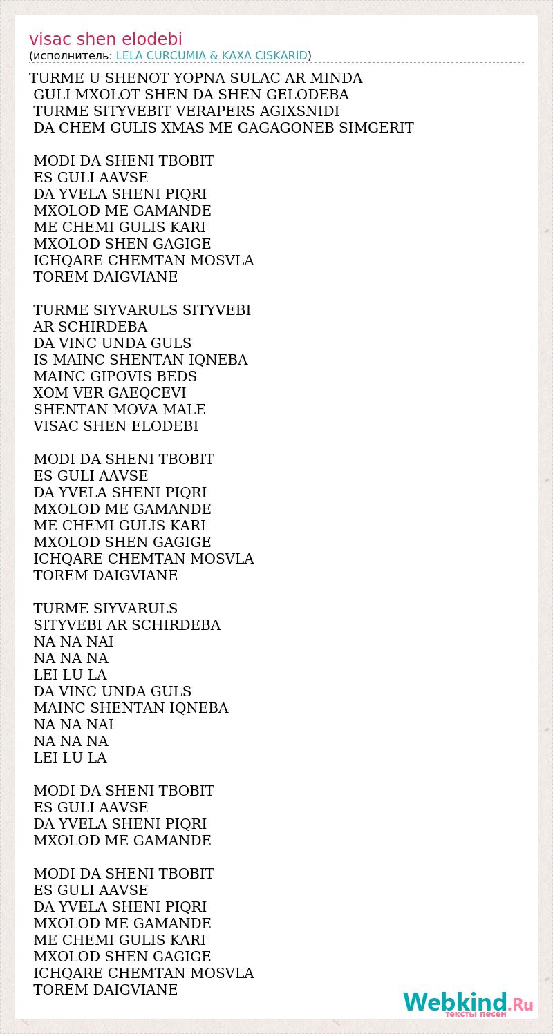 TURME U SHENOT YOPNA SULAC AR MINDA GULI MXOLOT SHEN DA SHEN GELODEBA TURME SITYVEBIT VERAPERS AGIXSNIDI DA CHEM GULIS XMAS ME GAGAGONEB SIMGERIT MODI DA SHENI TBOBIT ES GULI AAVSE DA YVELA SHENI PIQRI MXOLOD ME GAMANDE ME CHEMI GULIS KARI MXOLOD SHEN GAGIGE ICHQARE CHEMTAN MOSVLA TOREM DAIGVIANE TURME SIYVARULS SITYVEBI AR SCHIRDEBA DA VINC UNDA GULS IS MAINC SHENTAN IQNEBA MAINC GIPOVIS BEDS XOM VER GAEQCEVI SHENTAN MOVA MALE VISAC SHEN ELODEBI MODI DA SHENI TBOBIT ES GULI AAVSE DA YVELA SHENI PIQRI MXOLOD ME GAMANDE ME CHEMI GULIS KARI MXOLOD SHEN GAGIGE ICHQARE CHEMTAN MOSVLA TOREM DAIGVIANE TURME SIYVARULS SITYVEBI AR SCHIRDEBA NA NA NAI NA NA NA LEI LU LA DA VINC UNDA GULS MAINC SHENTAN IQNEBA NA NA NAI NA NA NA LEI LU LA MODI DA SHENI TBOBIT ES GULI AAVSE DA YVELA SHENI PIQRI MXOLOD ME GAMANDE MODI DA SHENI TBOBIT ES GULI AAVSE DA YVELA SHENI PIQRI MXOLOD ME GAMANDE ME CHEMI GULIS KARI MXOLOD SHEN GAGIGE ICHQARE CHEMTAN MOSVLA TOREM DAIGVIANE
