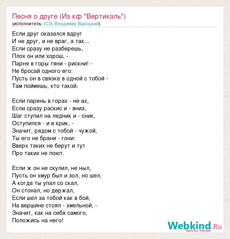 Если друг оказался вдруг И не друг, и не враг, а так... Если сразу не разберешь, Плох он или хорош, - Парня в горы тяни - рискни! - Не бросай одного его: Пусть он в связке в одной с тобой - Там поймешь, кто такой. Если парень в горах - не ах, Если сразу раскис и - вниз, Шаг ступил на ледник и - сник, Оступился - и в крик, - Значит, рядом с тобой - чужой, Ты его не брани - гони: Вверх таких не берут и тут Про таких не поют. Если ж он не скулил, не ныл, Пусть он хмур был и зол, но шел, А когда ты упал со скал, Он стонал, но держал, Если шел за тобой как в бой, На вершине стоял - хмельной, - Значит, как на себя самого, Положись на него!