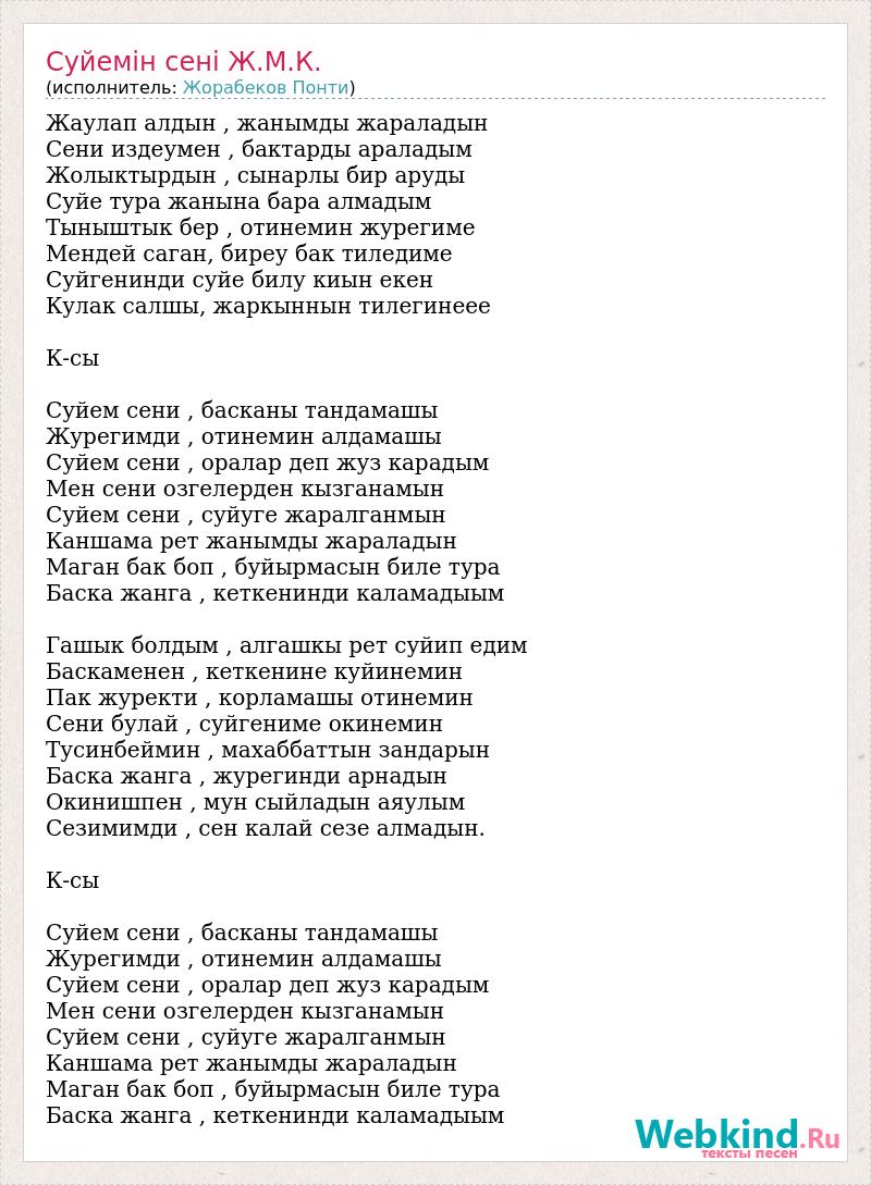 Жаулап алдын , жанымды жараладын Сени издеумен , бактарды араладым Жолыктырдын , сынарлы бир аруды Суйе тура жанына бара алмадым Тыныштык бер , отинемин журегиме Мендей саган, биреу бак тиледиме Суйгенинди суйе билу киын екен Кулак салшы, жаркыннын тилегинеее К-сы Суйем сени , басканы тандамашы Журегимди , отинемин алдамашы Суйем сени , оралар деп жуз карадым Мен сени озгелерден кызганамын Суйем сени , суйуге жаралганмын Каншама рет жанымды жараладын Маган бак боп , буйырмасын биле тура Баска жанга , кеткенинди каламадыым Гашык болдым , алгашкы рет суйип едим Баскаменен , кеткенине куйинемин Пак журекти , корламашы отинемин Сени булай , суйгениме окинемин Тусинбеймин , махаббаттын зандарын Баска жанга , журегинди арнадын Окинишпен , мун сыйладын аяулым Сезимимди , сен калай сезе алмадын. К-сы Суйем сени , басканы тандамашы Журегимди , отинемин алдамашы Суйем сени , оралар деп жуз карадым Мен сени озгелерден кызганамын Суйем сени , суйуге жаралганмын Каншама рет жанымды жараладын Маган бак боп , буйырмасын биле тура Баска жанга , кеткенинди каламадыым