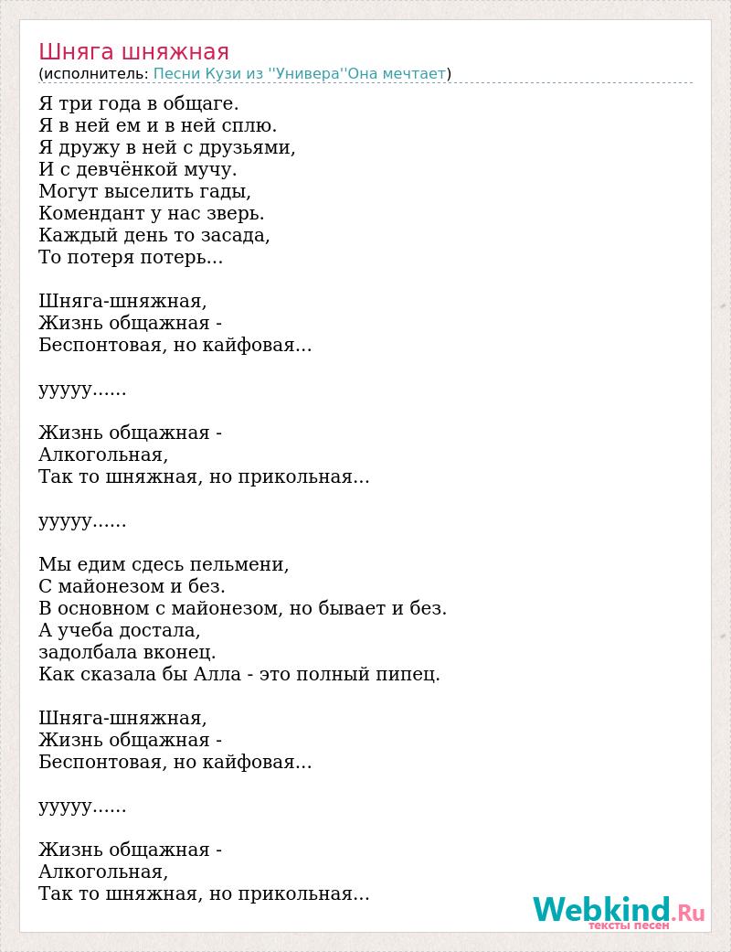 Я три года в общаге. Я в ней ем и в ней сплю. Я дружу в ней с друзьями, И с девчёнкой мучу. Могут выселить гады, Комендант у нас зверь. Каждый день то засада, То потеря потерь... Шняга-шняжная, Жизнь общажная - Беспонтовая, но кайфовая... ууууу...... Жизнь общажная - Алкогольная, Так то шняжная, но прикольная... ууууу...... Мы едим сдесь пельмени, С майонезом и без. В основном с майонезом, но бывает и без. А учеба достала, задолбала вконец. Как сказала бы Алла - это полный пипец. Шняга-шняжная, Жизнь общажная - Беспонтовая, но кайфовая... ууууу...... Жизнь общажная - Алкогольная, Так то шняжная, но прикольная...