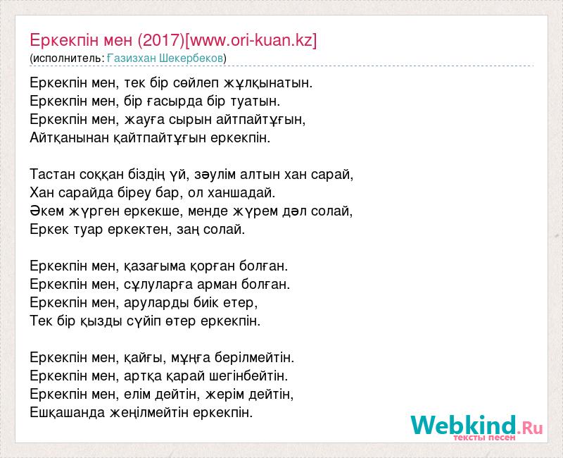 Еркекпін мен, тек бір сөйлеп жұлқынатын. Еркекпін мен, бір ғасырда бір туатын. Еркекпін мен, жауға сырын айтпайтұғын, Айтқанынан қайтпайтұғын еркекпін. Тастан соққан біздің үй, зəулім алтын хан сарай, Хан сарайда біреу бар, ол ханшадай. Əкем жүрген еркекше, менде жүрем дəл солай, Еркек туар еркектен, заң солай. Еркекпін мен, қазағыма қорған болған. Еркекпін мен, сұлуларға арман болған. Еркекпін мен, аруларды биік етер, Тек бір қызды сүйіп өтер еркекпін. Еркекпін мен, қайғы, мұңға берілмейтін. Еркекпін мен, артқа қарай шегінбейтін. Еркекпін мен, елім дейтін, жерім дейтін, Ешқашанда жеңілмейтін еркекпін.
