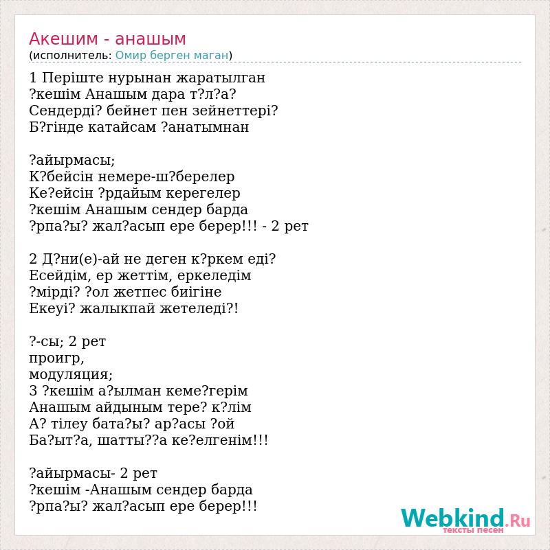 1 Періште нурынан жаратылган ?кешім Анашым дара т?л?а? Сендерді? бейнет пен зейнеттері? Б?гінде катайсам ?анатымнан ?айырмасы; К?бейсін немере-ш?берелер Ке?ейсін ?рдайым керегелер ?кешім Анашым сендер барда ?рпа?ы? жал?асып ере берер!!! - 2 рет 2 Д?ни(е)-ай не деген к?ркем еді? Есейдім, ер жеттім, еркеледім ?мірді? ?ол жетпес биігіне Екеуі? жалыкпай жетеледі?! ?-сы; 2 рет проигр, модуляция; 3 ?кешім а?ылман кеме?герім Анашым айдыным тере? к?лім А? тілеу бата?ы? ар?асы ?ой Ба?ыт?а, шатты??а ке?елгенім!!! ?айырмасы- 2 рет ?кешім -Анашым сендер барда ?рпа?ы? жал?асып ере берер!!!