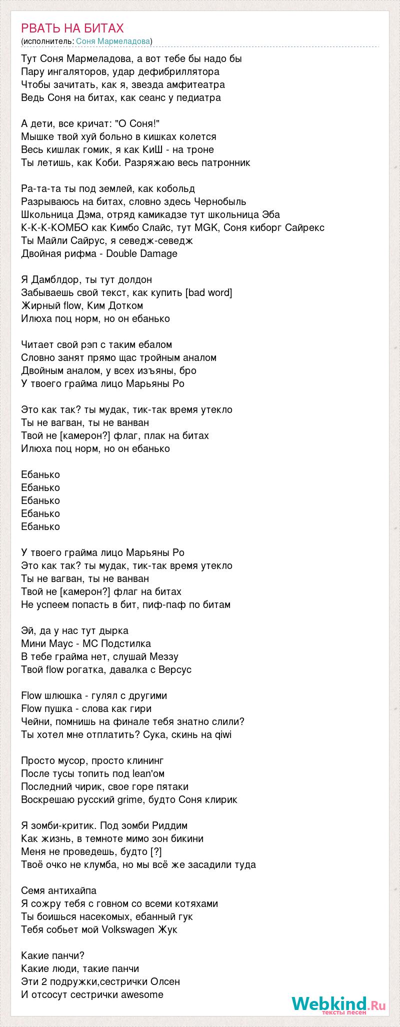 Тут Соня Мармеладова, а вот тебе бы надо бы Пару ингаляторов, удар дефибриллятора Чтобы зачитать, как я, звезда амфитеатра Ведь Соня на битах, как сеанс у педиатра А дети, все кричат: "О Соня!" Мышке твой хуй больно в кишках колется Весь кишлак гомик, я как КиШ - на троне Ты летишь, как Коби. Разряжаю весь патронник Ра-та-та ты под землей, как кобольд Разрываюсь на битах, словно здесь Чернобыль Школьница Дэма, отряд камикадзе тут школьница Эба К-К-К-КОМБО как Кимбо Слайс, тут MGK, Соня киборг Сайрекс Ты Майли Сайрус, я севедж-севедж Двойная рифма - Double Damage Я Дамблдор, ты тут долдон Забываешь свой текст, как купить [bad word] Жирный flow, Ким Дотком Илюха поц норм, но он ебанько Читает свой рэп с таким ебалом Словно занят прямо щас тройным аналом Двойным аналом, у всех изъяны, бро У твоего грайма лицо Марьяны Ро Это как так? ты мудак, тик-так время утекло Ты не вагван, ты не ванван Твой не [камерон?] флаг, плак на битах Илюха поц норм, но он ебанько Ебанько Ебанько Ебанько Ебанько Ебанько У твоего грайма лицо Марьяны Ро Это как так? ты мудак, тик-так время утекло Ты не вагван, ты не ванван Твой не [камерон?] флаг на битах Не успеем попасть в бит, пиф-паф по битам Эй, да у нас тут дырка Мини Маус - МС Подстилка В тебе грайма нет, слушай Меззу Твой flow рогатка, давалка с Версус Flow шлюшка - гулял с другими Flow пушка - слова как гири Чейни, помнишь на финале тебя знатно слили? Ты хотел мне отплатить? Сука, скинь на qiwi Просто мусор, просто клининг После тусы топить под lean'ом Последний чирик, свое горе пятаки Воскрешаю русский grime, будто Соня клирик Я зомби-критик. Под зомби Риддим Как жизнь, в темноте мимо зон бикини Меня не проведешь, будто [?] Твоё очко не клумба, но мы всё же засадили туда Семя антихайпа Я сожру тебя с говном со всеми котяхами Ты боишься насекомых, ебанный гук Тебя собьет мой Volkswagen Жук Какие панчи? Какие люди, такие панчи Эти 2 подружки,сестрички Олсен И отсосут сестрички awesome