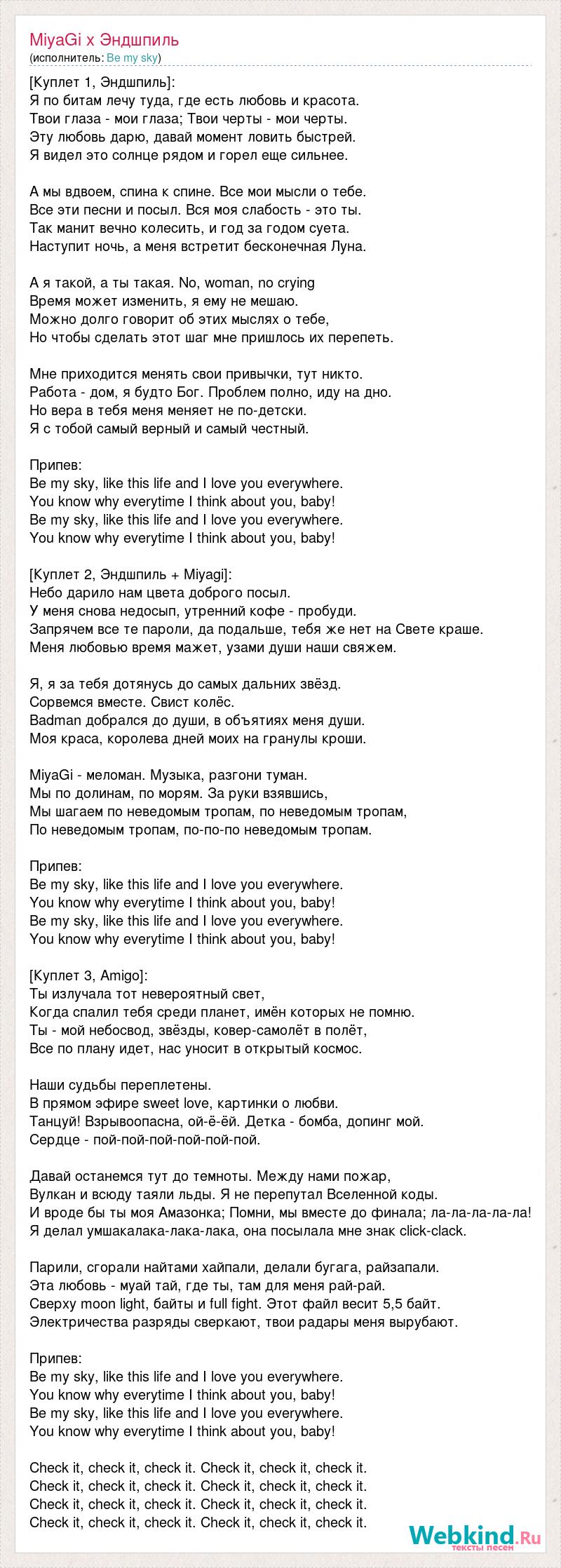 [Куплет 1, Эндшпиль]: Я по битам лечу туда, где есть любовь и красота. Твои глаза - мои глаза; Твои черты - мои черты. Эту любовь дарю, давай момент ловить быстрей. Я видел это солнце рядом и горел еще сильнее. А мы вдвоем, спина к спине. Все мои мысли о тебе. Все эти песни и посыл. Вся моя слабость - это ты. Так манит вечно колесить, и год за годом суета. Наступит ночь, а меня встретит бесконечная Луна. А я такой, а ты такая. No, woman, no crying Время может изменить, я ему не мешаю. Можно долго говорит об этих мыслях о тебе, Но чтобы сделать этот шаг мне пришлось их перепеть. Мне приходится менять свои привычки, тут никто. Работа - дом, я будто Бог. Проблем полно, иду на дно. Но вера в тебя меня меняет не по-детски. Я с тобой самый верный и самый честный. Припев: Be my sky, like this life and I love you everywhere. You know why everytime I think about you, baby! Be my sky, like this life and I love you everywhere. You know why everytime I think about you, baby! [Куплет 2, Эндшпиль + Miyagi]: Небо дарило нам цвета доброго посыл. У меня снова недосып, утренний кофе - пробуди. Запрячем все те пароли, да подальше, тебя же нет на Свете краше. Меня любовью время мажет, узами души наши свяжем. Я, я за тебя дотянусь до самых дальних звёзд. Сорвемся вместе. Свист колёс. Badman добрался до души, в объятиях меня души. Моя краса, королева дней моих на гранулы кроши. MiyaGi - меломан. Музыка, разгони туман. Мы по долинам, по морям. За руки взявшись, Мы шагаем по неведомым тропам, по неведомым тропам, По неведомым тропам, по-по-по неведомым тропам. Припев: Be my sky, like this life and I love you everywhere. You know why everytime I think about you, baby! Be my sky, like this life and I love you everywhere. You know why everytime I think about you, baby! [Куплет 3, Amigo]: Ты излучала тот невероятный свет, Когда спалил тебя среди планет, имён которых не помню. Ты - мой небосвод, звёзды, ковер-самолёт в полёт, Все по плану идет, нас уносит в открытый космос. Наши судьбы переплетены. В прямом эфире sweet love, картинки о любви. Танцуй! Взрывоопасна, ой-ё-ёй. Детка - бомба, допинг мой. Сердце - пой-пой-пой-пой-пой-пой. Давай останемся тут до темноты. Между нами пожар, Вулкан и всюду таяли льды. Я не перепутал Вселенной коды. И вроде бы ты моя Амазонка; Помни, мы вместе до финала; ла-ла-ла-ла-ла! Я делал умшакалака-лака-лака, она посылала мне знак click-clack. Парили, сгорали найтами хайпали, делали бугага, райзапали. Эта любовь - муай тай, где ты, там для меня рай-рай. Сверху moon light, байты и full fight. Этот файл весит 5,5 байт. Электричества разряды сверкают, твои радары меня вырубают. Припев: Be my sky, like this life and I love you everywhere. You know why everytime I think about you, baby! Be my sky, like this life and I love you everywhere. You know why everytime I think about you, baby! Check it, check it, check it. Check it, check it, check it. Check it, check it, check it. Check it, check it, check it. Check it, check it, check it. Check it, check it, check it. Check it, check it, check it. Check it, check it, check it.
