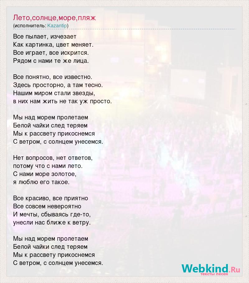 Все пылает, изчезает Как картинка, цвет меняет. Все играет, все искрится. Рядом с нами те же лица. Все понятно, все известно. Здесь просторно, а там тесно. Нашим миром стали звезды, в них нам жить не так уж просто. Мы над морем пролетаем Белой чайки след теряем Мы к рассвету прикоснемся С ветром, с солнцем унесемся. Нет вопросов, нет ответов, потому что с нами лето. С нами море золотое, я люблю его такое. Все красиво, все приятно Все совсем невероятно И мечты, сбываясь где-то, унесли нас ближе к ветру. Мы над морем пролетаем Белой чайки след теряем Мы к рассвету прикоснемся С ветром, с солнцем унесемся.
