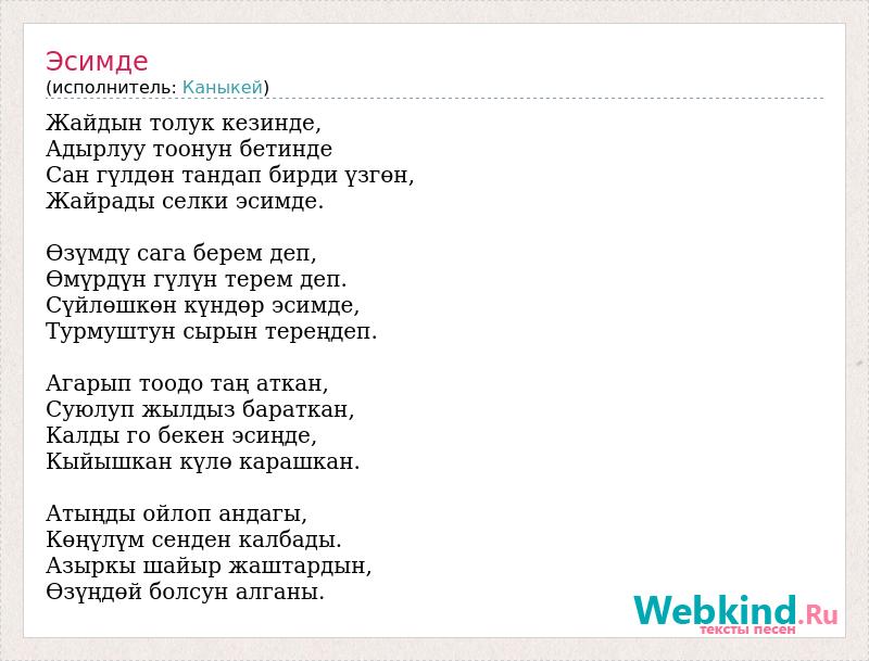 Жайдын толук кезинде, Адырлуу тоонун бетинде Сан гүлдөн тандап бирди үзгөн, Жайрады селки эсимде. Өзүмдү сага берем деп, Өмүрдүн гүлүн терем деп. Сүйлөшкөн күндөр эсимде, Турмуштун сырын тереңдеп. Агарып тоодо таң аткан, Суюлуп жылдыз бараткан, Калды го бекен эсиңде, Кыйышкан күлө карашкан. Атыңды ойлоп андагы, Көңүлүм сенден калбады. Азыркы шайыр жаштардын, Өзүңдөй болсун алганы.