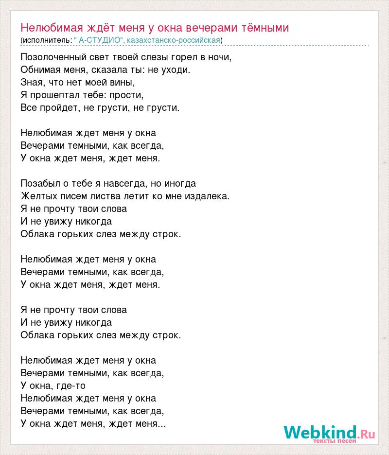 Позолоченный свет твоей слезы горел в ночи, Обнимая меня, сказала ты: не уходи. Зная, что нет моей вины, Я прошептал тебе: прости, Все пройдет, не грусти, не грусти. Нелюбимая ждет меня у окна Вечерами темными, как всегда, У окна ждет меня, ждет меня. Позабыл о тебе я навсегда, но иногда Желтых писем листва летит ко мне издалека. Я не прочту твои слова И не увижу никогда Облака горьких слез между строк. Нелюбимая ждет меня у окна Вечерами темными, как всегда, У окна ждет меня, ждет меня. Я не прочту твои слова И не увижу никогда Облака горьких слез между строк. Нелюбимая ждет меня у окна Вечерами темными, как всегда, У окна, где-то Нелюбимая ждет меня у окна Вечерами темными, как всегда, У окна ждет меня, ждет меня...