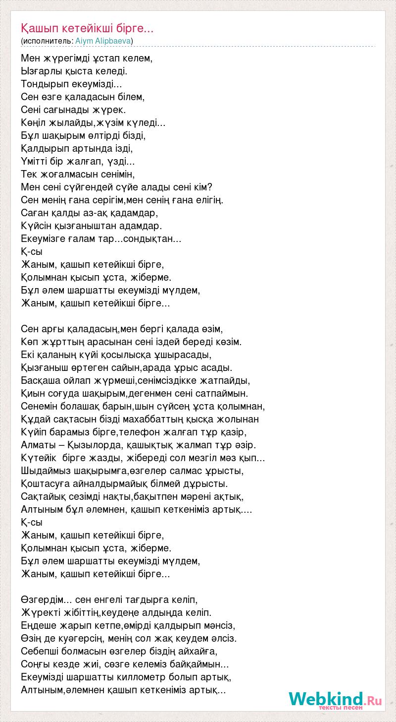 Мен жүрегімді ұстап келем, Ызғарлы қыста келеді. Тондырып екеумізді... Сен өзге қаладасын білем, Сені сағынады жүрек. Көңіл жылайды,жүзім күледі... Бұл шақырым өлтірді бізді, Қалдырып артында ізді, Үмітті бір жалғап, үзді... Тек жоғалмасын сенімін, Мен сені сүйгендей сүйе алады сені кім? Сен менің ғана серігім,мен сенің ғана елігің. Саған қалды аз-ақ қадамдар, Күйсін қызғаныштан адамдар. Екеумізге ғалам тар...сондықтан... Қ-сы Жаным, қашып кетейікші бірге, Қолымнан қысып ұста, жіберме. Бұл әлем шаршатты екеумізді мүлдем, Жаным, қашып кетейікші бірге... Сен арғы қаладасың,мен бергі қалада өзім, Көп жұрттың арасынан сені іздей береді көзім. Екі қаланың күйі қосылысқа ұшырасады, Қызғаныш өртеген сайын,арада ұрыс асады. Басқаша ойлап жүрмеші,сенімсіздікке жатпайды, Қиын соғуда шақырым,дегенмен сені сатпаймын. Сенемін болашақ барын,шын сүйсең ұста қолымнан, Құдай сақтасын бізді махаббаттың қысқа жолынан Күйіп барамыз бірге,телефон жалғап тұр қазір, Алматы – Қызылорда, қашықтық жалмап тұр әзір. Күтейік бірге жазды, жібереді сол мезгіл мәз қып... Шыдаймыз шақырымға,өзгелер салмас ұрысты, Қоштасуға айналдырмайық білмей дұрысты. Сақтайық сезімді нақты,бақытпен мәрені ақтық, Алтыным бұл әлемнен, қашып кеткеніміз артық.... Қ-сы Жаным, қашып кетейікші бірге, Қолымнан қысып ұста, жіберме. Бұл әлем шаршатты екеумізді мүлдем, Жаным, қашып кетейікші бірге... Өзгердім... сен енгелі тағдырға келіп, Жүректі жібіттің,кеудеңе алдыңда келіп. Еңдеше жарып кетпе,өмірді қалдырып мәнсіз, Өзің де куәгерсің, менің сол жақ кеудем әлсіз. Себепші болмасын өзгелер біздің айхайға, Соңғы кезде жиі, сөзге келеміз байқаймын... Екеумізді шаршатты киллометр болып артық, Алтыным,әлемнен қашып кеткеніміз артық...