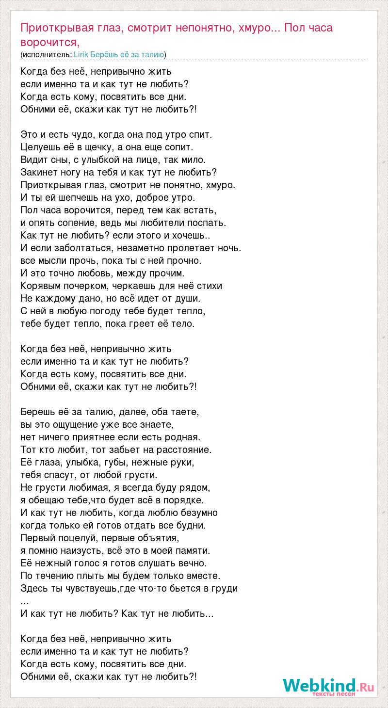 Когда без неё, непривычно жить если именно та и как тут не любить? Когда есть кому, посвятить все дни. Обними её, скажи как тут не любить?! Это и есть чудо, когда она под утро спит. Целуешь её в щечку, а она еще сопит. Видит сны, с улыбкой на лице, так мило. Закинет ногу на тебя и как тут не любить? Приоткрывая глаз, смотрит не понятно, хмуро. И ты ей шепчешь на ухо, доброе утро. Пол часа ворочится, перед тем как встать, и опять сопение, ведь мы любители поспать. Как тут не любить? если этого и хочешь.. И если заболтаться, незаметно пролетает ночь. все мысли прочь, пока ты с ней прочно. И это точно любовь, между прочим. Корявым почерком, черкаешь для неё стихи Не каждому дано, но всё идет от души. С ней в любую погоду тебе будет тепло, тебе будет тепло, пока греет её тело. Когда без неё, непривычно жить если именно та и как тут не любить? Когда есть кому, посвятить все дни. Обними её, скажи как тут не любить?! Берешь её за талию, далее, оба таете, вы это ощущение уже все знаете, нет ничего приятнее если есть родная. Тот кто любит, тот забьет на расстояние. Её глаза, улыбка, губы, нежные руки, тебя спасут, от любой грусти. Не грусти любимая, я всегда буду рядом, я обещаю тебе,что будет всё в порядке. И как тут не любить, когда люблю безумно когда только ей готов отдать все будни. Первый поцелуй, первые объятия, я помню наизусть, всё это в моей памяти. Её нежный голос я готов слушать вечно. По течению плыть мы будем только вместе. Здесь ты чувствуешь,где что-то бьется в груди ... И как тут не любить? Как тут не любить... Когда без неё, непривычно жить если именно та и как тут не любить? Когда есть кому, посвятить все дни. Обними её, скажи как тут не любить?!