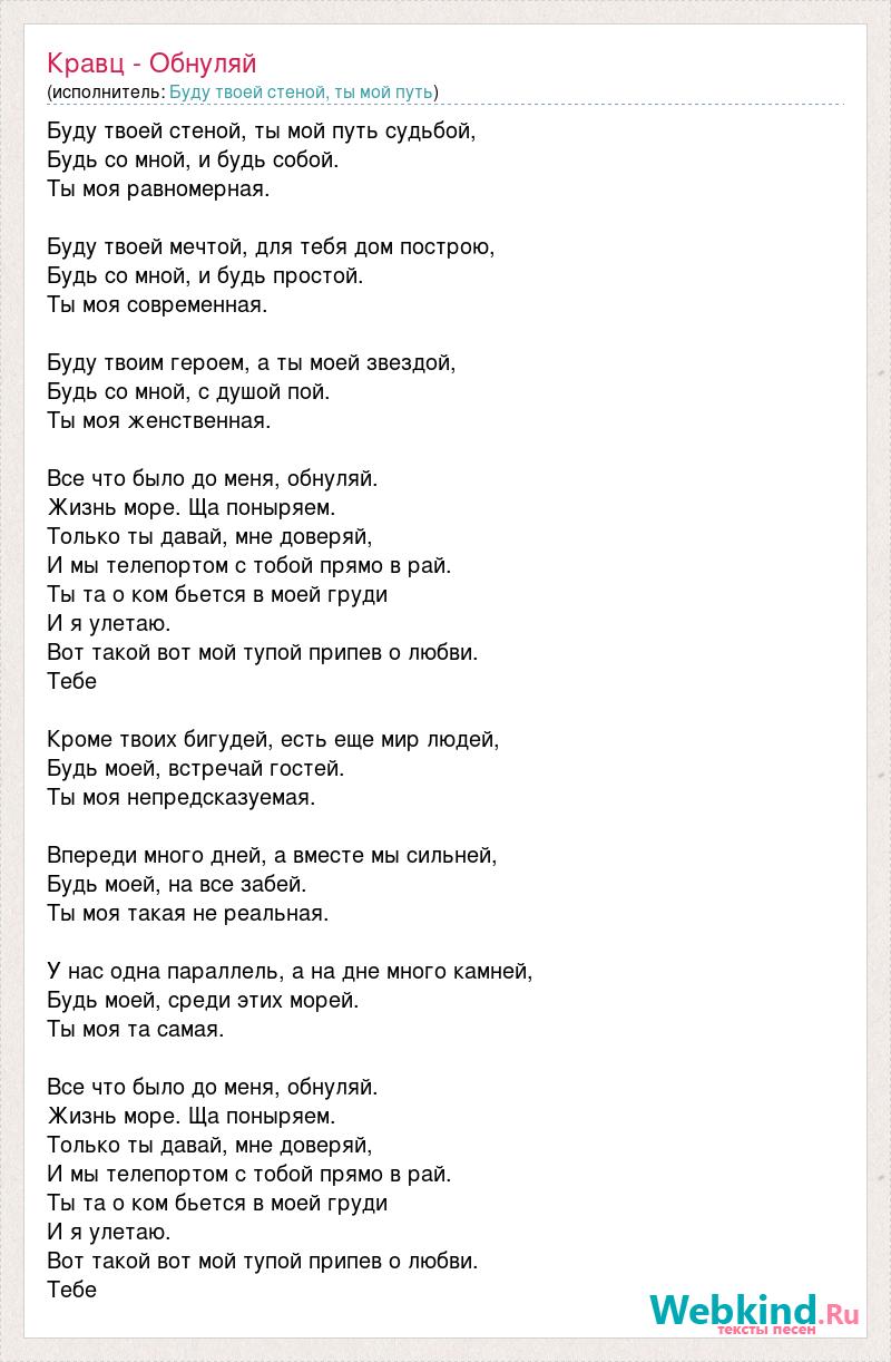 Буду твоей стеной, ты мой путь судьбой, Будь со мной, и будь собой. Ты моя равномерная. Буду твоей мечтой, для тебя дом построю, Будь со мной, и будь простой. Ты моя современная. Буду твоим героем, а ты моей звездой, Будь со мной, с душой пой. Ты моя женственная. Все что было до меня, обнуляй. Жизнь море. Ща поныряем. Только ты давай, мне доверяй, И мы телепортом с тобой прямо в рай. Ты та о ком бьется в моей груди И я улетаю. Вот такой вот мой тупой припев о любви. Тебе Кроме твоих бигудей, есть еще мир людей, Будь моей, встречай гостей. Ты моя непредсказуемая. Впереди много дней, а вместе мы сильней, Будь моей, на все забей. Ты моя такая не реальная. У нас одна параллель, а на дне много камней, Будь моей, среди этих морей. Ты моя та самая. Все что было до меня, обнуляй. Жизнь море. Ща поныряем. Только ты давай, мне доверяй, И мы телепортом с тобой прямо в рай. Ты та о ком бьется в моей груди И я улетаю. Вот такой вот мой тупой припев о любви. Тебе