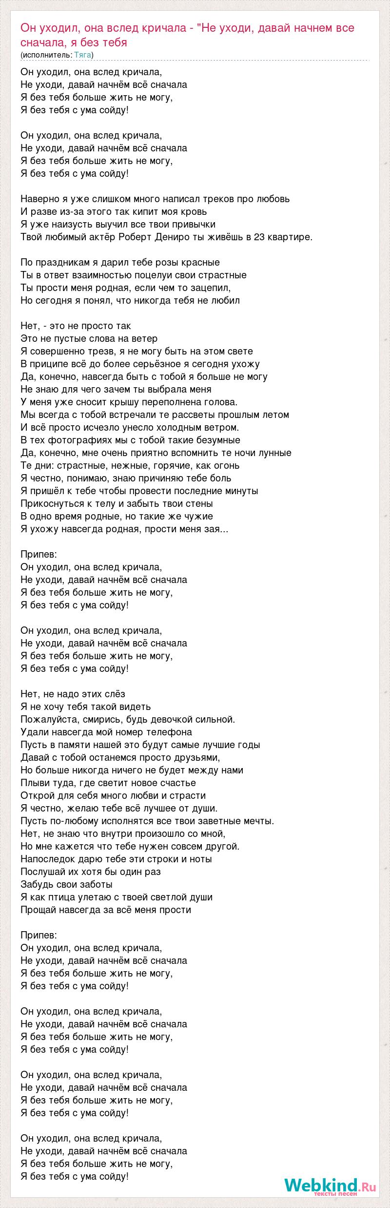 Он уходил, она вслед кричала, Не уходи, давай начнём всё сначала Я без тебя больше жить не могу, Я без тебя с ума сойду! Он уходил, она вслед кричала, Не уходи, давай начнём всё сначала Я без тебя больше жить не могу, Я без тебя с ума сойду! Наверно я уже слишком много написал треков про любовь И разве из-за этого так кипит моя кровь Я уже наизусть выучил все твои привычки Твой любимый актёр Роберт Дениро ты живёшь в 23 квартире. По праздникам я дарил тебе розы красные Ты в ответ взаимностью поцелуи свои страстные Ты прости меня родная, если чем то зацепил, Но сегодня я понял, что никогда тебя не любил Нет, - это не просто так Это не пустые слова на ветер Я совершенно трезв, я не могу быть на этом свете В приципе всё до более серьёзное я сегодня ухожу Да, конечно, навсегда быть с тобой я больше не могу Не знаю для чего зачем ты выбрала меня У меня уже сносит крышу переполнена голова. Мы всегда с тобой встречали те рассветы прошлым летом И всё просто исчезло унесло холодным ветром. В тех фотографиях мы с тобой такие безумные Да, конечно, мне очень приятно вспомнить те ночи лунные Те дни: страстные, нежные, горячие, как огонь Я честно, понимаю, знаю причиняю тебе боль Я пришёл к тебе чтобы провести последние минуты Прикоснуться к телу и забыть твои стены В одно время родные, но такие же чужие Я ухожу навсегда родная, прости меня зая... Припев: Он уходил, она вслед кричала, Не уходи, давай начнём всё сначала Я без тебя больше жить не могу, Я без тебя с ума сойду! Он уходил, она вслед кричала, Не уходи, давай начнём всё сначала Я без тебя больше жить не могу, Я без тебя с ума сойду! Нет, не надо этих слёз Я не хочу тебя такой видеть Пожалуйста, смирись, будь девочкой сильной. Удали навсегда мой номер телефона Пусть в памяти нашей это будут самые лучшие годы Давай с тобой останемся просто друзьями, Но больше никогда ничего не будет между нами Плыви туда, где светит новое счастье Открой для себя много любви и страсти Я честно, желаю тебе всё лучшее от души. Пусть по-любому исполнятся все твои заветные мечты. Нет, не знаю что внутри произошло со мной, Но мне кажется что тебе нужен совсем другой. Напоследок дарю тебе эти строки и ноты Послушай их хотя бы один раз Забудь свои заботы Я как птица улетаю с твоей светлой души Прощай навсегда за всё меня прости Припев: Он уходил, она вслед кричала, Не уходи, давай начнём всё сначала Я без тебя больше жить не могу, Я без тебя с ума сойду! Он уходил, она вслед кричала, Не уходи, давай начнём всё сначала Я без тебя больше жить не могу, Я без тебя с ума сойду! Он уходил, она вслед кричала, Не уходи, давай начнём всё сначала Я без тебя больше жить не могу, Я без тебя с ума сойду! Он уходил, она вслед кричала, Не уходи, давай начнём всё сначала Я без тебя больше жить не могу, Я без тебя с ума сойду!