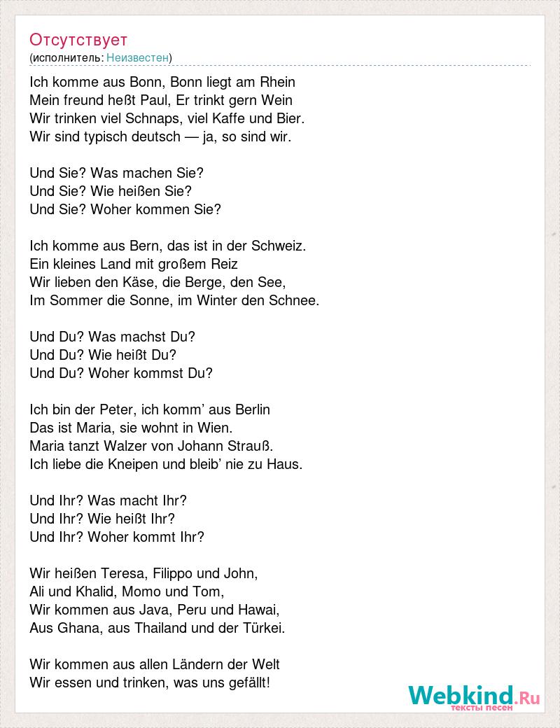 Ich komme aus Bonn, Bonn liegt am Rhein Mein freund heßt Paul, Er trinkt gern Wein Wir trinken viel Schnaps, viel Kaffe und Bier. Wir sind typisch deutsch — ja, so sind wir. Und Sie? Was machen Sie? Und Sie? Wie heißen Sie? Und Sie? Woher kommen Sie? Ich komme aus Bern, das ist in der Schweiz. Ein kleines Land mit großem Reiz Wir lieben den Käse, die Berge, den See, Im Sommer die Sonne, im Winter den Schnee. Und Du? Was machst Du? Und Du? Wie heißt Du? Und Du? Woher kommst Du? Ich bin der Peter, ich komm’ aus Berlin Das ist Maria, sie wohnt in Wien. Maria tanzt Walzer von Johann Strauß. Ich liebe die Kneipen und bleib’ nie zu Haus. Und Ihr? Was macht Ihr? Und Ihr? Wie heißt Ihr? Und Ihr? Woher kommt Ihr? Wir heißen Teresa, Filippo und John, Ali und Khalid, Momo und Tom, Wir kommen aus Java, Peru und Hawai, Aus Ghana, aus Thailand und der Türkei. Wir kommen aus allen Ländern der Welt Wir essen und trinken, was uns gefällt!
