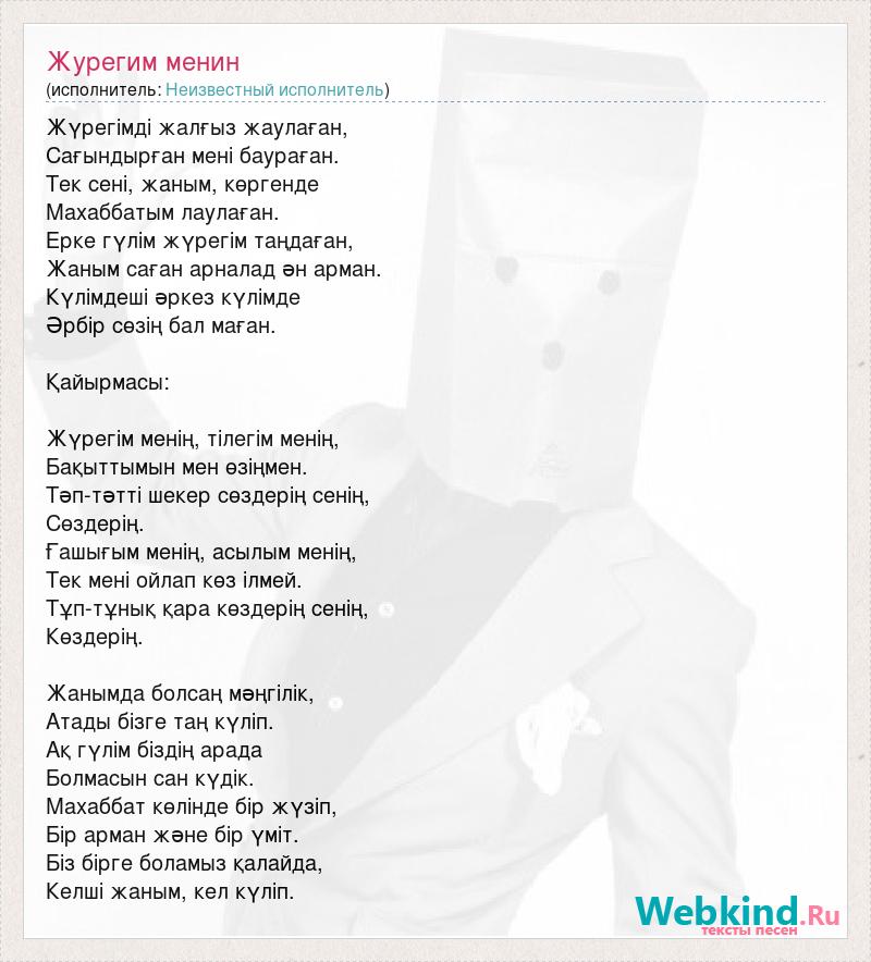 Жүрегімді жалғыз жаулаған, Сағындырған мені баураған. Тек сені, жаным, көргенде Махаббатым лаулаған. Ерке гүлім жүрегім таңдаған, Жаным саған арналад əн арман. Күлімдеші əркез күлімде Əрбір сөзің бал маған. Қайырмасы: Жүрегім менің, тілегім менің, Бақыттымын мен өзіңмен. Тəп-тəтті шекер сөздерің сенің, Сөздерің. Ғашығым менің, асылым менің, Тек мені ойлап көз ілмей. Тұп-тұнық қара көздерің сенің, Көздерің. Жанымда болсаң мəңгілік, Атады бізге таң күліп. Ақ гүлім біздің арада Болмасын сан күдік. Махаббат көлінде бір жүзіп, Бір арман жəне бір үміт. Біз бірге боламыз қалайда, Келші жаным, кел күліп.