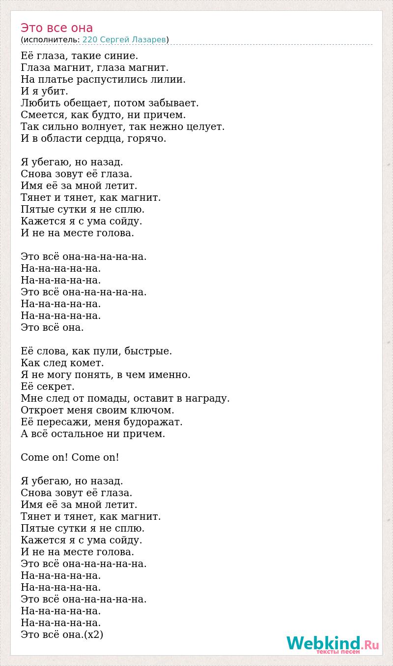 Её глаза, такие синие. Глаза магнит, глаза магнит. На платье распустились лилии. И я убит. Любить обещает, потом забывает. Смеется, как будто, ни причем. Так сильно волнует, так нежно целует. И в области сердца, горячо. Я убегаю, но назад. Снова зовут её глаза. Имя её за мной летит. Тянет и тянет, как магнит. Пятые сутки я не сплю. Кажется я с ума сойду. И не на месте голова. Это всё она-на-на-на-на. На-на-на-на-на. На-на-на-на-на. Это всё она-на-на-на-на. На-на-на-на-на. На-на-на-на-на. Это всё она. Её слова, как пули, быстрые. Как след комет. Я не могу понять, в чем именно. Её секрет. Мне след от помады, оставит в награду. Откроет меня своим ключом. Её пересажи, меня будоражат. А всё остальное ни причем. Come on! Come on! Я убегаю, но назад. Снова зовут её глаза. Имя её за мной летит. Тянет и тянет, как магнит. Пятые сутки я не сплю. Кажется я с ума сойду. И не на месте голова. Это всё она-на-на-на-на. На-на-на-на-на. На-на-на-на-на. Это всё она-на-на-на-на. На-на-на-на-на. На-на-на-на-на. Это всё она.(х2)