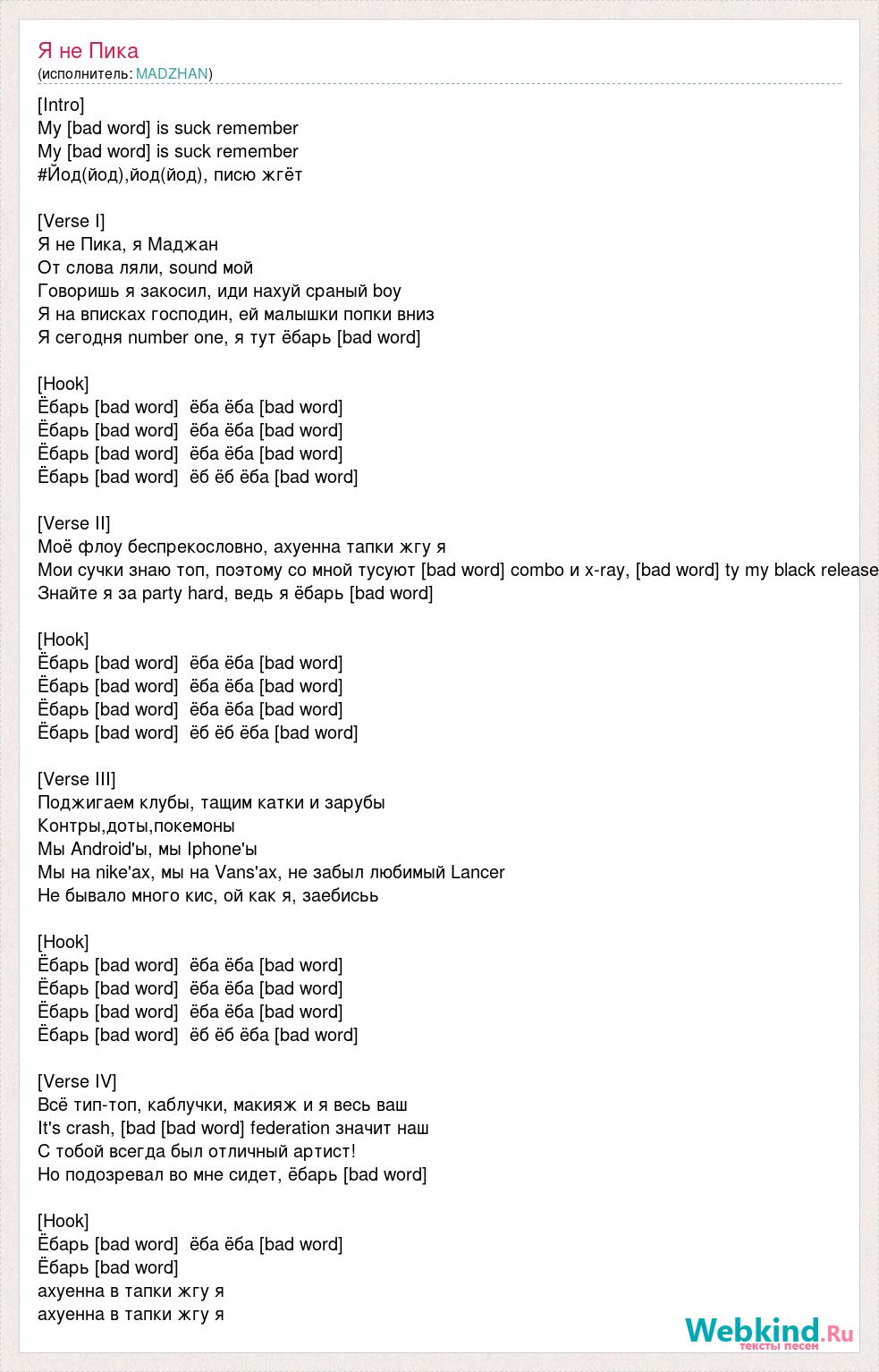 [Intro] My [bad word] is suck remember My [bad word] is suck remember #Йод(йод),йод(йод), писю жгёт [Verse I] Я не Пика, я Маджан От слова ляли, sound мой Говоришь я закосил, иди нахуй сраный boy Я на вписках господин, ей малышки попки вниз Я сегодня number one, я тут ёбарь [bad word] [Hook] Ёбарь [bad word] ёба ёба [bad word] Ёбарь [bad word] ёба ёба [bad word] Ёбарь [bad word] ёба ёба [bad word] Ёбарь [bad word] ёб ёб ёба [bad word] [Verse II] Моё флоу беспрекословно, ахуенна тапки жгу я Мои сучки знаю топ, поэтому со мной тусуют [bad word] combo и x-ray, [bad word] ty my black release Знайте я за party hard, ведь я ёбарь [bad word] [Hook] Ёбарь [bad word] ёба ёба [bad word] Ёбарь [bad word] ёба ёба [bad word] Ёбарь [bad word] ёба ёба [bad word] Ёбарь [bad word] ёб ёб ёба [bad word] [Verse III] Поджигаем клубы, тащим катки и зарубы Контры,доты,покемоны Мы Android'ы, мы Iphone'ы Мы на nike'ах, мы на Vans'ах, не забыл любимый Lancer Не бывало много кис, ой как я, заебисьь [Hook] Ёбарь [bad word] ёба ёба [bad word] Ёбарь [bad word] ёба ёба [bad word] Ёбарь [bad word] ёба ёба [bad word] Ёбарь [bad word] ёб ёб ёба [bad word] [Verse IV] Всё тип-топ, каблучки, макияж и я весь ваш It's crash, [bad [bad word] federation значит наш С тобой всегда был отличный артист! Но подозревал во мне сидет, ёбарь [bad word] [Hook] Ёбарь [bad word] ёба ёба [bad word] Ёбарь [bad word] ахуенна в тапки жгу я ахуенна в тапки жгу я