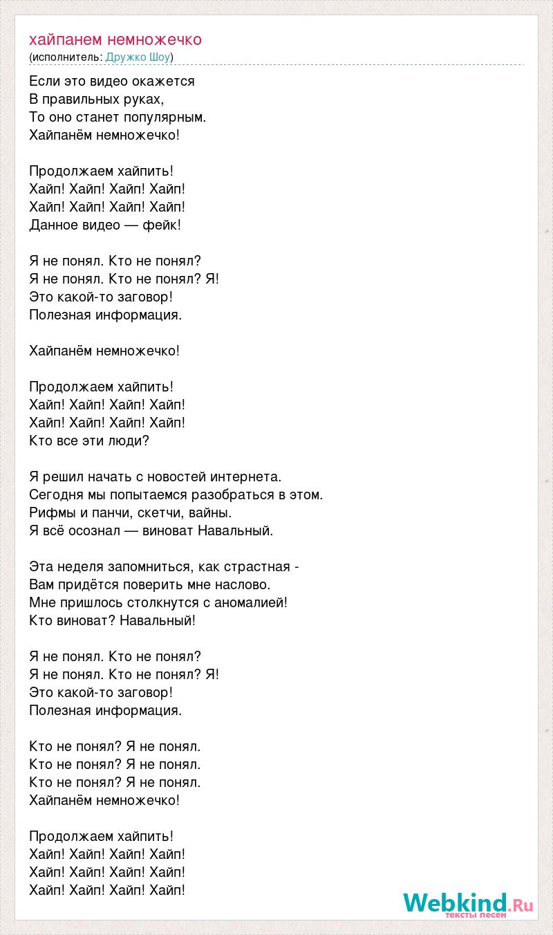 Если это видео окажется В правильных руках, То оно станет популярным. Хайпанём немножечко! Продолжаем хайпить! Хайп! Хайп! Хайп! Хайп! Хайп! Хайп! Хайп! Хайп! Данное видео — фейк! Я не понял. Кто не понял? Я не понял. Кто не понял? Я! Это какой-то заговор! Полезная информация. Хайпанём немножечко! Продолжаем хайпить! Хайп! Хайп! Хайп! Хайп! Хайп! Хайп! Хайп! Хайп! Кто все эти люди? Я решил начать с новостей интернета. Сегодня мы попытаемся разобраться в этом. Рифмы и панчи, скетчи, вайны. Я всё осознал — виноват Навальный. Эта неделя запомниться, как страстная - Вам придётся поверить мне наслово. Мне пришлось столкнутся с аномалией! Кто виноват? Навальный! Я не понял. Кто не понял? Я не понял. Кто не понял? Я! Это какой-то заговор! Полезная информация. Кто не понял? Я не понял. Кто не понял? Я не понял. Кто не понял? Я не понял. Хайпанём немножечко! Продолжаем хайпить! Хайп! Хайп! Хайп! Хайп! Хайп! Хайп! Хайп! Хайп! Хайп! Хайп! Хайп! Хайп!