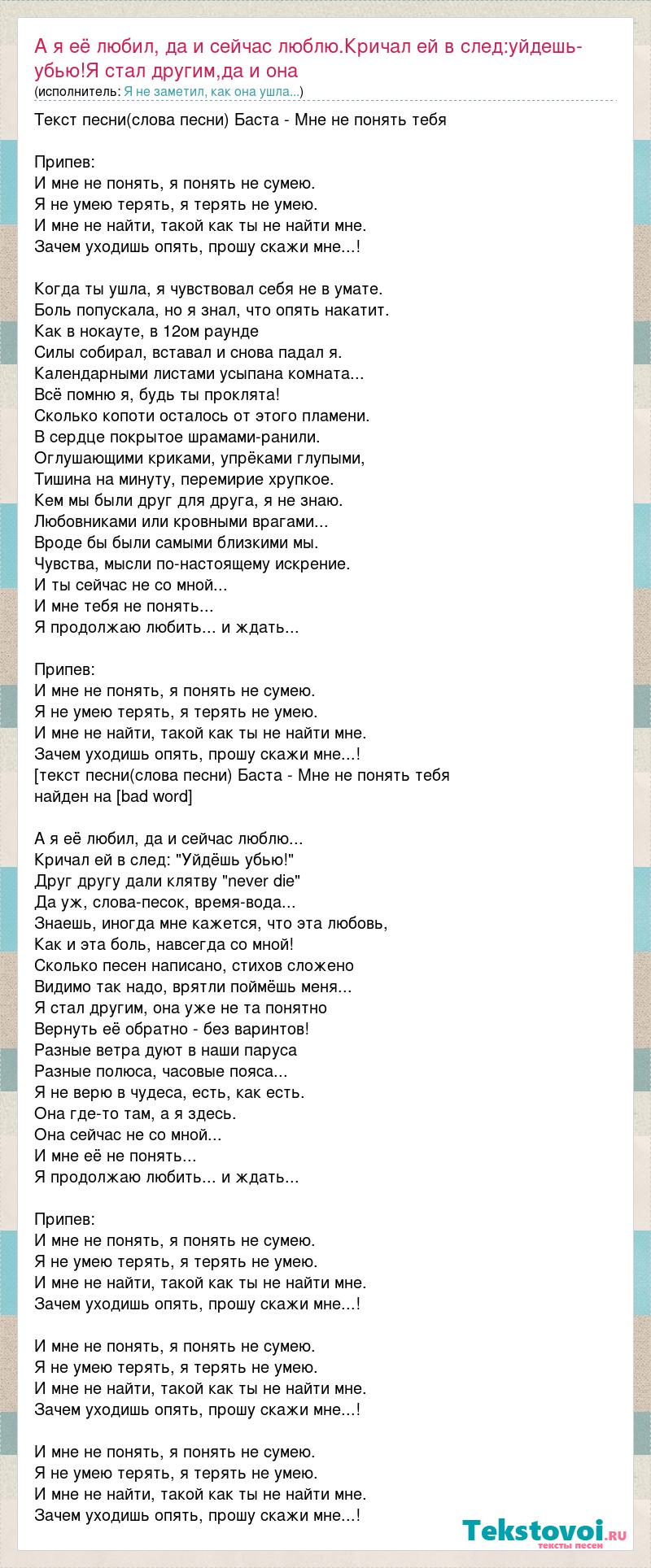 Текст песни(слова песни) Баста - Мне не понять тебя Припев: И мне не понять, я понять не сумею. Я не умею терять, я терять не умею. И мне не найти, такой как ты не найти мне. Зачем уходишь опять, прошу скажи мне...! Когда ты ушла, я чувствовал себя не в умате. Боль попускала, но я знал, что опять накатит. Как в нокауте, в 12ом раунде Силы собирал, вставал и снова падал я. Календарными листами усыпана комната... Всё помню я, будь ты проклята! Сколько копоти осталось от этого пламени. В сердце покрытое шрамами-ранили. Оглушающими криками, упрёками глупыми, Тишина на минуту, перемирие хрупкое. Кем мы были друг для друга, я не знаю. Любовниками или кровными врагами... Вроде бы были самыми близкими мы. Чувства, мысли по-настоящему искрение. И ты сейчас не со мной... И мне тебя не понять... Я продолжаю любить... и ждать... Припев: И мне не понять, я понять не сумею. Я не умею терять, я терять не умею. И мне не найти, такой как ты не найти мне. Зачем уходишь опять, прошу скажи мне...! [текст песни(слова песни) Баста - Мне не понять тебя найден на [bad word] А я её любил, да и сейчас люблю... Кричал ей в след: "Уйдёшь убью!" Друг другу дали клятву "never die" Да уж, слова-песок, время-вода... Знаешь, иногда мне кажется, что эта любовь, Как и эта боль, навсегда со мной! Сколько песен написано, стихов сложено Видимо так надо, врятли поймёшь меня... Я стал другим, она уже не та понятно Вернуть её обратно - без варинтов! Разные ветра дуют в наши паруса Разные полюса, часовые пояса... Я не верю в чудеса, есть, как есть. Она где-то там, а я здесь. Она сейчас не со мной... И мне её не понять... Я продолжаю любить... и ждать... Припев: И мне не понять, я понять не сумею. Я не умею терять, я терять не умею. И мне не найти, такой как ты не найти мне. Зачем уходишь опять, прошу скажи мне...! И мне не понять, я понять не сумею. Я не умею терять, я терять не умею. И мне не найти, такой как ты не найти мне. Зачем уходишь опять, прошу скажи мне...! И мне не понять, я понять не сумею. Я не умею терять, я терять не умею. И мне не найти, такой как ты не найти мне. Зачем уходишь опять, прошу скажи мне...!