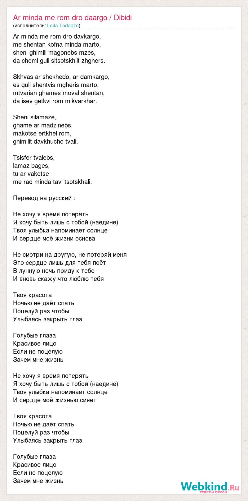 Ar minda me rom dro davkargo, me shentan kofna minda marto, sheni ghimili magonebs mzes, da chemi guli sitsotskhlit zhghers. Skhvas ar shekhedo, ar damkargo, es guli shentvis mgheris marto, mtvarian ghames moval shentan, da isev getkvi rom mikvarkhar. Sheni silamaze, ghame ar madzinebs, makotse ertkhel rom, ghimilit davkhucho tvali. Tsisfer tvalebs, lamaz bages, tu ar vakotse me rad minda tavi tsotskhali. Перевод на русский : Не хочу я время потерять Я хочу быть лишь с тобой (наедине) Твоя улыбка напоминает солнце И сердце моё жизни основа Не смотри на другую, не потеряй меня Это сердце лишь для тебя поёт В лунную ночь приду к тебе И вновь скажу что люблю тебя Твоя красота Ночью не даёт спать Поцелуй раз чтобы Улыбаясь закрыть глаз Голубые глаза Красивое лицо Если не поцелую Зачем мне жизнь Не хочу я время потерять Я хочу быть лишь с тобой (наедине) Твоя улыбка напоминает солнце И сердце моё жизнью сияет Твоя красота Ночью не даёт спать Поцелуй раз чтобы Улыбаясь закрыть глаз Голубые глаза Красивое лицо Если не поцелую Зачем мне жизнь