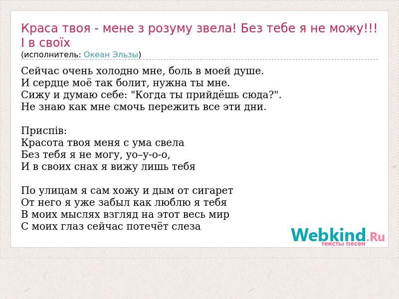 А как ты думаешь, о чем песня "Краса твоя - мене з розуму звела! Без тебе я не можу!!! І в своїх" ?