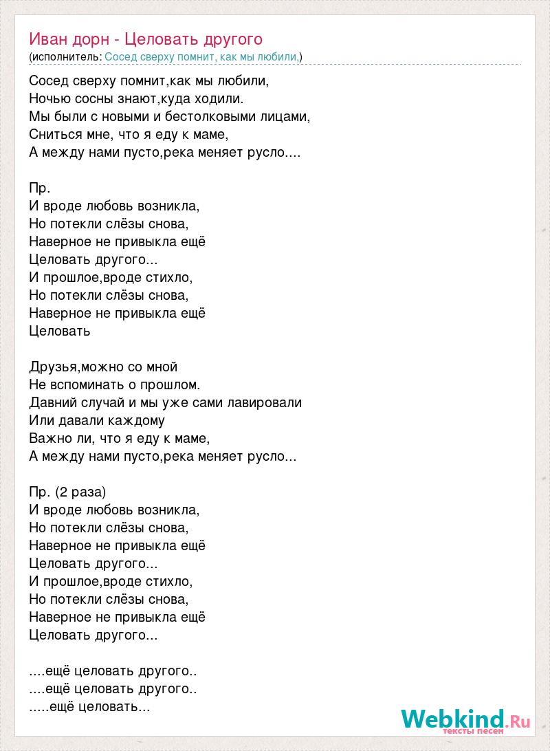 Сосед сверху помнит,как мы любили, Ночью сосны знают,куда ходили. Мы были с новыми и бестолковыми лицами, Сниться мне, что я еду к маме, А между нами пусто,река меняет русло.... Пр. И вроде любовь возникла, Но потекли слёзы снова, Наверное не привыкла ещё Целовать другого... И прошлое,вроде стихло, Но потекли слёзы снова, Наверное не привыкла ещё Целовать Друзья,можно со мной Не вспоминать о прошлом. Давний случай и мы уже сами лавировали Или давали каждому Важно ли, что я еду к маме, А между нами пусто,река меняет русло... Пр. (2 раза) И вроде любовь возникла, Но потекли слёзы снова, Наверное не привыкла ещё Целовать другого... И прошлое,вроде стихло, Но потекли слёзы снова, Наверное не привыкла ещё Целовать другого... ....ещё целовать другого.. ....ещё целовать другого.. .....ещё целовать...