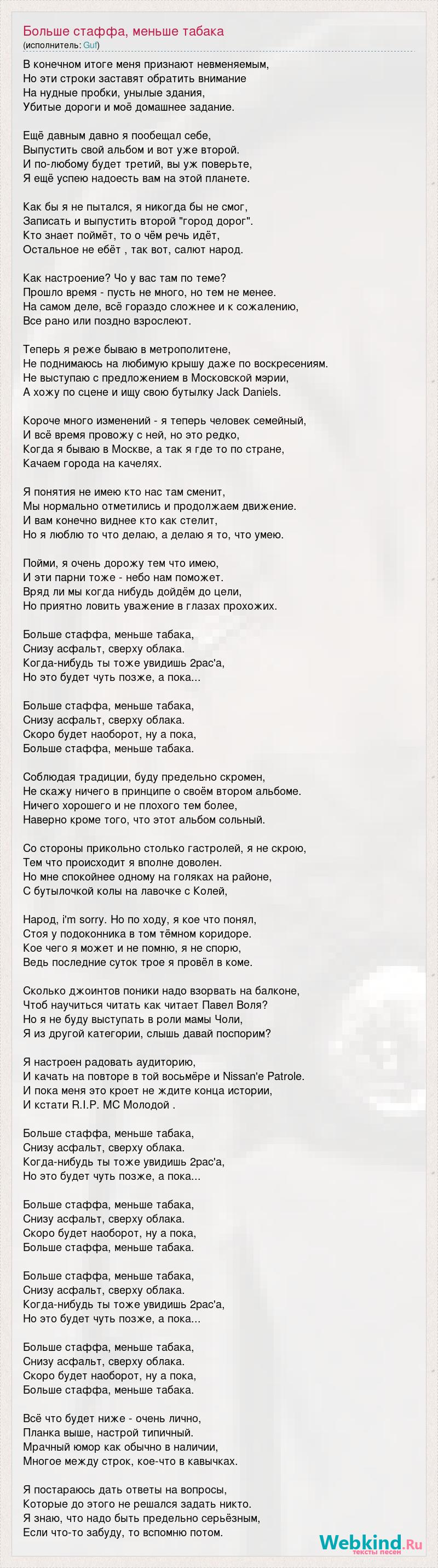 В конечном итоге меня признают невменяемым, Но эти строки заставят обратить внимание На нудные пробки, унылые здания, Убитые дороги и моё домашнее задание. Ещё давным давно я пообещал себе, Выпустить свой альбом и вот уже второй. И по-любому будет третий, вы уж поверьте, Я ещё успею надоесть вам на этой планете. Как бы я не пытался, я никогда бы не смог, Записать и выпустить второй "город дорог". Кто знает поймёт, то о чём речь идёт, Остальное не ебёт , так вот, салют народ. Как настроение? Чо у вас там по теме? Прошло время - пусть не много, но тем не менее. На самом деле, всё гораздо сложнее и к сожалению, Все рано или поздно взрослеют. Теперь я реже бываю в метрополитене, Не поднимаюсь на любимую крышу даже по воскресениям. Не выступаю с предложением в Московской мэрии, А хожу по сцене и ищу свою бутылку Jack Daniels. Короче много изменений - я теперь человек семейный, И всё время провожу с ней, но это редко, Когда я бываю в Москве, а так я где то по стране, Качаем города на качелях. Я понятия не имею кто нас там сменит, Мы нормально отметились и продолжаем движение. И вам конечно виднее кто как стелит, Но я люблю то что делаю, а делаю я то, что умею. Пойми, я очень дорожу тем что имею, И эти парни тоже - небо нам поможет. Вряд ли мы когда нибудь дойдём до цели, Но приятно ловить уважение в глазах прохожих. Больше стаффа, меньше табака, Снизу асфальт, сверху облака. Когда-нибудь ты тоже увидишь 2pac'а, Но это будет чуть позже, а пока... Больше стаффа, меньше табака, Снизу асфальт, сверху облака. Скоро будет наоборот, ну а пока, Больше стаффа, меньше табака. Соблюдая традиции, буду предельно скромен, Не скажу ничего в принципе о своём втором альбоме. Ничего хорошего и не плохого тем более, Наверно кроме того, что этот альбом сольный. Со стороны прикольно столько гастролей, я не скрою, Тем что происходит я вполне доволен. Но мне спокойнее одному на голяках на районе, С бутылочкой колы на лавочке с Колей, Народ, i'm sorry. Но по ходу, я кое что понял, Стоя у подоконника в том тёмном коридоре. Кое чего я может и не помню, я не спорю, Ведь последние суток трое я провёл в коме. Сколько джоинтов поники надо взорвать на балконе, Чтоб научиться читать как читает Павел Воля? Но я не буду выступать в роли мамы Чоли, Я из другой категории, слышь давай поспорим? Я настроен радовать аудиторию, И качать на повторе в той восьмёре и Nissan'е Patrole. И пока меня это кроет не ждите конца истории, И кстати R.I.P. MC Молодой . Больше стаффа, меньше табака, Снизу асфальт, сверху облака. Когда-нибудь ты тоже увидишь 2pac'а, Но это будет чуть позже, а пока... Больше стаффа, меньше табака, Снизу асфальт, сверху облака. Скоро будет наоборот, ну а пока, Больше стаффа, меньше табака. Больше стаффа, меньше табака, Снизу асфальт, сверху облака. Когда-нибудь ты тоже увидишь 2pac'а, Но это будет чуть позже, а пока... Больше стаффа, меньше табака, Снизу асфальт, сверху облака. Скоро будет наоборот, ну а пока, Больше стаффа, меньше табака. Всё что будет ниже - очень лично, Планка выше, настрой типичный. Мрачный юмор как обычно в наличии, Многое между строк, кое-что в кавычках. Я постараюсь дать ответы на вопросы, Которые до этого не решался задать никто. Я знаю, что надо быть предельно серьёзным, Если что-то забуду, то вспомню потом.