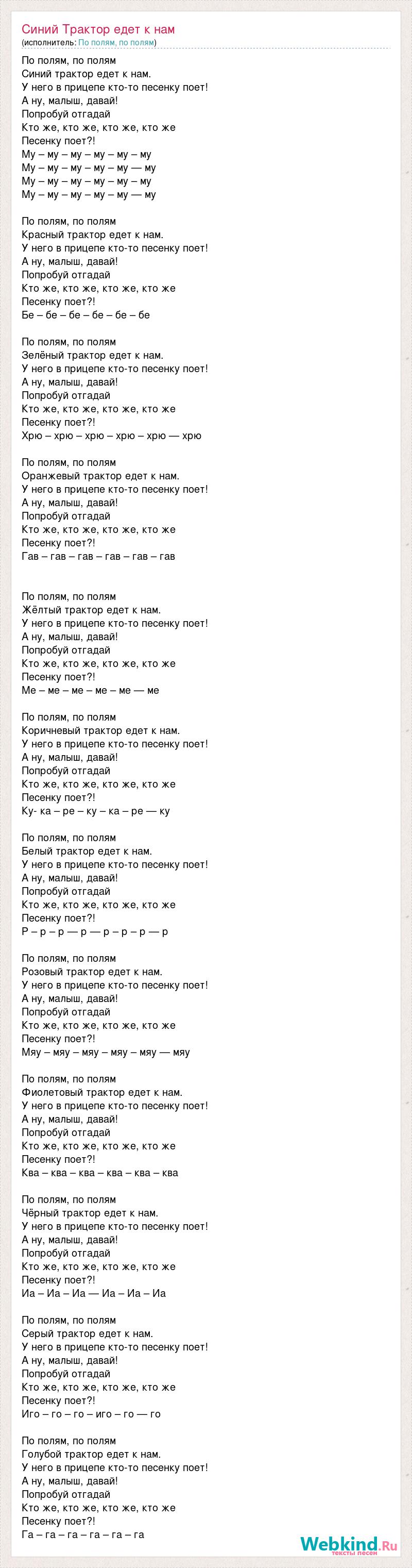 По полям, по полям Синий трактор едет к нам. У него в прицепе кто-то песенку поет! А ну, малыш, давай! Попробуй отгадай Кто же, кто же, кто же, кто же Песенку поет?! Му – му – му – му – му – му Му – му – му – му – му — му Му – му – му – му – му – му Му – му – му – му – му — му По полям, по полям Красный трактор едет к нам. У него в прицепе кто-то песенку поет! А ну, малыш, давай! Попробуй отгадай Кто же, кто же, кто же, кто же Песенку поет?! Бе – бе – бе – бе – бе – бе По полям, по полям Зелёный трактор едет к нам. У него в прицепе кто-то песенку поет! А ну, малыш, давай! Попробуй отгадай Кто же, кто же, кто же, кто же Песенку поет?! Хрю – хрю – хрю – хрю – хрю — хрю По полям, по полям Оранжевый трактор едет к нам. У него в прицепе кто-то песенку поет! А ну, малыш, давай! Попробуй отгадай Кто же, кто же, кто же, кто же Песенку поет?! Гав – гав – гав – гав – гав – гав По полям, по полям Жёлтый трактор едет к нам. У него в прицепе кто-то песенку поет! А ну, малыш, давай! Попробуй отгадай Кто же, кто же, кто же, кто же Песенку поет?! Ме – ме – ме – ме – ме — ме По полям, по полям Коричневый трактор едет к нам. У него в прицепе кто-то песенку поет! А ну, малыш, давай! Попробуй отгадай Кто же, кто же, кто же, кто же Песенку поет?! Ку- ка – ре – ку – ка – ре — ку По полям, по полям Белый трактор едет к нам. У него в прицепе кто-то песенку поет! А ну, малыш, давай! Попробуй отгадай Кто же, кто же, кто же, кто же Песенку поет?! Р – р – р — р — р – р – р — р По полям, по полям Розовый трактор едет к нам. У него в прицепе кто-то песенку поет! А ну, малыш, давай! Попробуй отгадай Кто же, кто же, кто же, кто же Песенку поет?! Мяу – мяу – мяу – мяу – мяу — мяу По полям, по полям Фиолетовый трактор едет к нам. У него в прицепе кто-то песенку поет! А ну, малыш, давай! Попробуй отгадай Кто же, кто же, кто же, кто же Песенку поет?! Ква – ква – ква – ква – ква – ква По полям, по полям Чёрный трактор едет к нам. У него в прицепе кто-то песенку поет! А ну, малыш, давай! Попробуй отгадай Кто же, кто же, кто же, кто же Песенку поет?! Иа – Иа – Иа — Иа – Иа – Иа По полям, по полям Серый трактор едет к нам. У него в прицепе кто-то песенку поет! А ну, малыш, давай! Попробуй отгадай Кто же, кто же, кто же, кто же Песенку поет?! Иго – го – го – иго – го — го По полям, по полям Голубой трактор едет к нам. У него в прицепе кто-то песенку поет! А ну, малыш, давай! Попробуй отгадай Кто же, кто же, кто же, кто же Песенку поет?! Га – га – га – га – га – га
