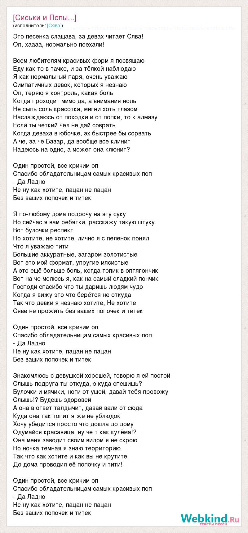 Это песенка слащава, за девах читает Сява! Оп, хаааа, нормально поехали! Всем любителям красивых форм я посвящаю Еду как то в тачке, и за тёлкой наблюдаю Я как нормальный паря, очень уважаю Симпатичных девок, которых я незнаю Оп, теряю я контроль, какая боль Когда проходит мимо да, а внимания ноль Не сыпь соль красотка, мигни хоть глазом Наслаждаюсь от походки и от попки, то к алмазу Если ты четкий чел не дай соврать Когда деваха в юбочке, эх быстрее бы сорвать А че, за че Базар, да вообще все клинит Надеюсь на одно, а может она клюнит? Один простой, все кричим оп Спасибо обладательницам самых красивых поп - Да Ладно Не ну как хотите, пацан не пацан Без ваших попочек и титек Я по-любому дома подрочу на эту суку Но сейчас я вам ребятки, расскажу такую штуку Вот булочки респект Но хотите, не хотите, лично я с пеленок понял Что я уважаю тити Большие аккуратные, загаром золотистые Вот это мой формат, упругие мясистые А это ещё больше боль, когда топик в оптягончик Вот на че молюсь я, как на самый сладкий пончик Господи спасибо что ты даришь людям чудо Когда я вижу это что берётся не откуда Так что девки я незнаю хотите, Не хотите Сяве не прожить без ваших попочек и титек Один простой, все кричим оп Спасибо обладательницам самых красивых поп - Да Ладно Не ну как хотите, пацан не пацан Без ваших попочек и титек Знакомлюсь с девушкой хорошей, говорю я ей постой Слышь подруга ты откуда, э куда спешишь? Булочки и мячики, ноги от ушей, давай тебя провожу Слышь!? Будешь здоровей А она в ответ талдычит, давай вали от сюда Куда она так топит я же не ублюдок Хочу убедится просто что дошла до дому Одумайся красавица, ну че т как кулёма!? Она меня заводит своим видом я не скрою Но ночка тёмная я знаю территорию Так что как хотите и как вы не крутите До дома проводил её попочку и тити! Один простой, все кричим оп Спасибо обладательницам самых красивых поп - Да Ладно Не ну как хотите, пацан не пацан Без ваших попочек и титек