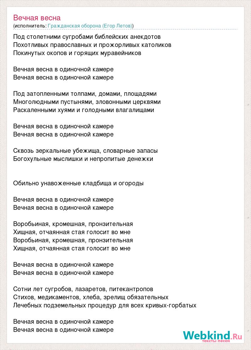 Под столетними сугробами библейских анекдотов Похотливых православных и прожорливых католиков Покинутых окопов и горящих муравейников Вечная весна в одиночной камере Вечная весна в одиночной камере Под затопленными толпами, домами, площадями Многолюдными пустынями, зловонными церквями Раскаленными хуями и голодными влагалищами Вечная весна в одиночной камере Вечная весна в одиночной камере Сквозь зеркальные убежища, словарные запасы Богохульные мыслишки и непропитые денежки Обильно унавоженные кладбища и огороды Вечная весна в одиночной камере Вечная весна в одиночной камере Воробьиная, кромешная, пронзительная Хищная, отчаянная стая голосит во мне Воробьиная, кромешная, пронзительная Хищная, отчаянная стая голосит во мне Вечная весна в одиночной камере Вечная весна в одиночной камере Сотни лет сугробов, лазаретов, питекантропов Стихов, медикаментов, хлеба, зрелищ обязательных Лечебных подземельных процедур для всех кривых-горбатых Вечная весна в одиночной камере Вечная весна в одиночной камере