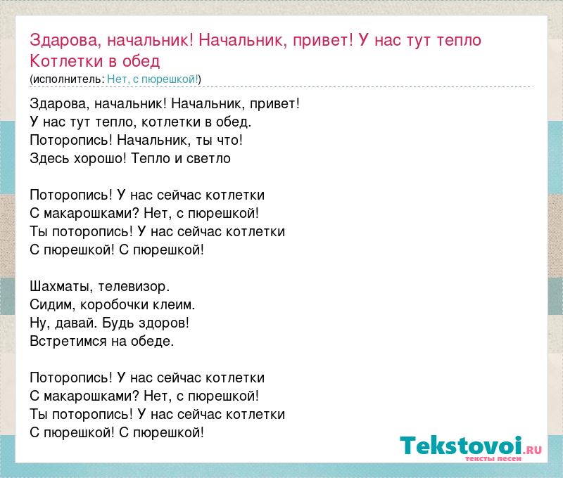 Главная→Исполнители→Нет, с пюрешкой!→Здарова, начальник! Начальник, привет! У нас тут тепло Котлетки в обед