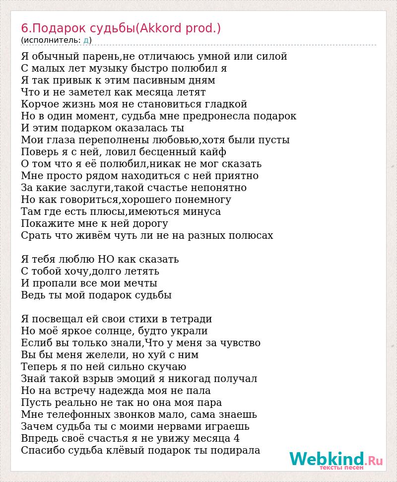 Я обычный парень,не отличаюсь умной или силой С малых лет музыку быстро полюбил я Я так привык к этим пасивным дням Что и не заметел как месяца летят Корчое жизнь моя не становиться гладкой Но в один момент, судьба мне предронесла подарок И этим подарком оказалась ты Мои глаза переполнены любовью,хотя были пусты Поверь я с ней, ловил бесценный кайф О том что я её полюбил,никак не мог сказать Мне просто рядом находиться с ней приятно За какие заслуги,такой счастье непонятно Но как говориться,хорошего понемногу Там где есть плюсы,имеються минуса Покажите мне к ней дорогу Срать что живём чуть ли не на разных полюсах Я тебя люблю НО как сказать С тобой хочу,долго летять И пропали все мои мечты Ведь ты мой подарок судьбы Я посвещал ей свои стихи в тетради Но моё яркое солнце, будто украли Еслиб вы только знали,Что у меня за чувство Вы бы меня желели, но хуй с ним Теперь я по ней сильно скучаю Знай такой взрыв эмоций я никогад получал Но на встречу надежда моя не пала Пусть реально не так но она моя пара Мне телефонных звонков мало, сама знаешь Зачем судьба ты с моими нервами играешь Впредь своё счастья я не увижу месяца 4 Спасибо судьба клёвый подарок ты подирала