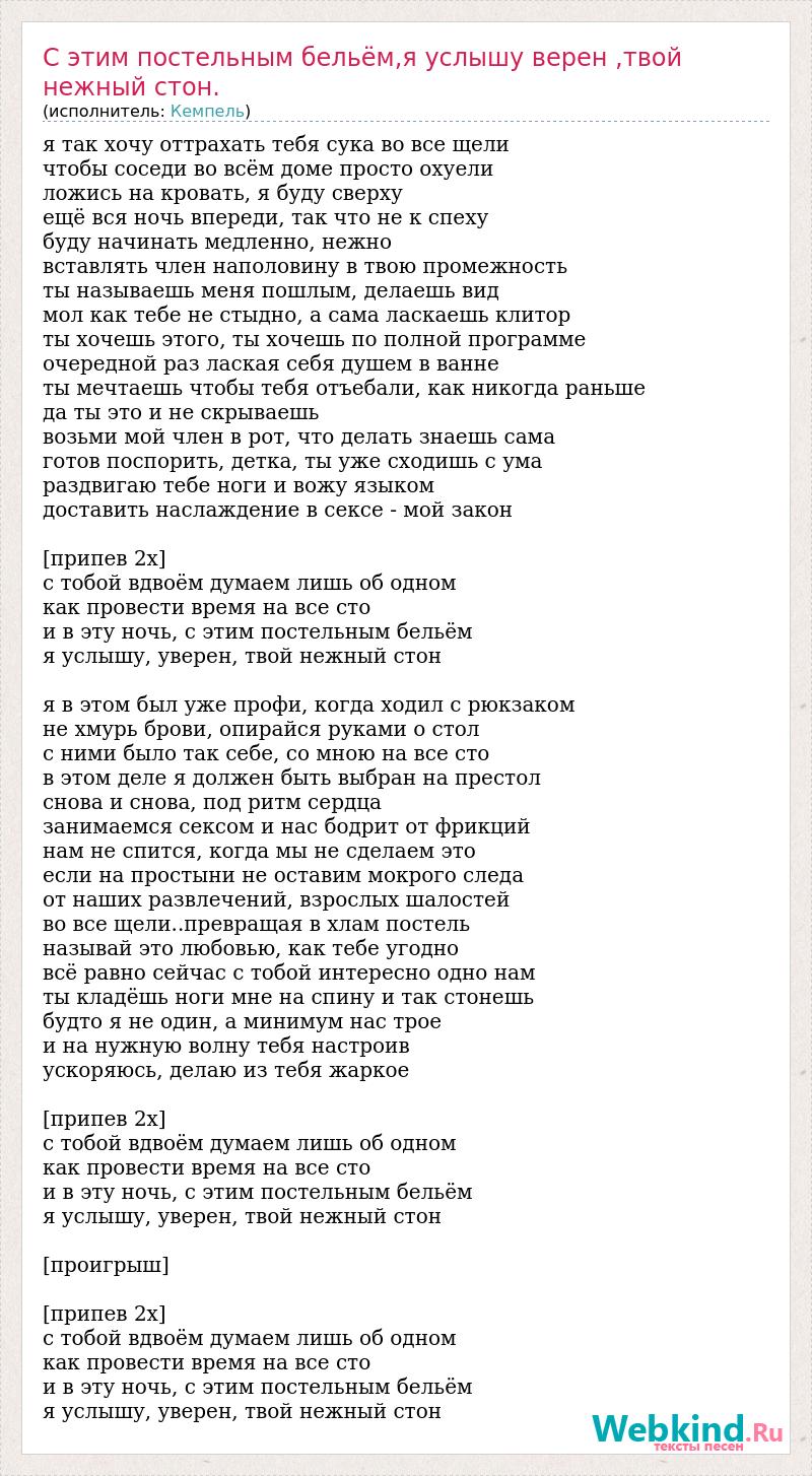я так хочу оттрахать тебя сука во все щели чтобы соседи во всём доме просто охуели ложись на кровать, я буду сверху ещё вся ночь впереди, так что не к спеху буду начинать медленно, нежно вставлять член наполовину в твою промежность ты называешь меня пошлым, делаешь вид мол как тебе не стыдно, а сама ласкаешь клитор ты хочешь этого, ты хочешь по полной программе очередной раз лаская себя душем в ванне ты мечтаешь чтобы тебя отъебали, как никогда раньше да ты это и не скрываешь возьми мой член в рот, что делать знаешь сама готов поспорить, детка, ты уже сходишь с ума раздвигаю тебе ноги и вожу языком доставить наслаждение в сексе - мой закон [припев 2х] с тобой вдвоём думаем лишь об одном как провести время на все сто и в эту ночь, с этим постельным бельём я услышу, уверен, твой нежный стон я в этом был уже профи, когда ходил с рюкзаком не хмурь брови, опирайся руками о стол с ними было так себе, со мною на все сто в этом деле я должен быть выбран на престол снова и снова, под ритм сердца занимаемся сексом и нас бодрит от фрикций нам не спится, когда мы не сделаем это если на простыни не оставим мокрого следа от наших развлечений, взрослых шалостей во все щели..превращая в хлам постель называй это любовью, как тебе угодно всё равно сейчас с тобой интересно одно нам ты кладёшь ноги мне на спину и так стонешь будто я не один, а минимум нас трое и на нужную волну тебя настроив ускоряюсь, делаю из тебя жаркое [припев 2х] с тобой вдвоём думаем лишь об одном как провести время на все сто и в эту ночь, с этим постельным бельём я услышу, уверен, твой нежный стон [проигрыш] [припев 2х] с тобой вдвоём думаем лишь об одном как провести время на все сто и в эту ночь, с этим постельным бельём я услышу, уверен, твой нежный стон