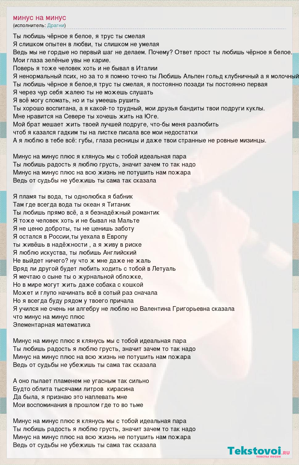 Ты любишь чёрное я белое, я трус ты смелая Я слишком опытен в любви, ты слишком не умелая Ведь мы не гордые но первый шаг не делаем. Почему? Ответ прост ты любишь чёрное я белое. Мои глаза зелёные увы не карие. Поверь я тоже человек хоть и не бывал в Италии Я ненормальный псих, но за то я помню точно ты Любишь Альпен гольд клубничный а я молочный Ты любишь чёрное я белое,я трус ты смелая, я постоянно позади ты постоянно первая Я через чур себя жалею ты не можешь слушать Я всё могу сломать, но и ты умеешь рушить Ты хорошо воспитана, а я какой-то трудный, мои друзья бандиты твои подруги куклы. Мне нравится на Севере ты хочешь жить на Юге. Мой брат мешает жить твоей лучшей подруге, что-бы меня разлюбить чтоб я казался гадким ты на листке писала все мои недостатки А я люблю в тебе всё: губы, глаза ресницы и даже твои странные не ровные мизинцы. Минус на минус плюс я клянусь мы с тобой идеальная пара Ты любишь радость я люблю грусть, значит зачем то так надо Минус на минус плюс на всю жизнь не потушить нам пожара Ведь от судьбы не убежишь ты сама так сказала Я пламя ты вода, ты однолюбка я бабник Там где всегда вода ты океан я Титаник Ты любишь прямо всё, а я безнадёжный романтик Я тоже человек хоть и не бывал на Мальте Я не ценю доброты, ты не ценишь заботу Я остался в России,ты уехала в Европу ты живёшь в надёжности , а я живу в риске Я люблю искуства, ты любишь Английский Не выйдет ничего? ну что ж мне даже не жаль Вряд ли другой будет любить ходить с тобой в Летуаль Я мечтаю о сыне ты о журнальной обложке, Но в мире могут жить даже собака с кошкой Может и глупо начинать всё в сотый раз сначала Но я всегда буду рядом у твоего причала Я учился не очень ни алгебру не люблю но Валентина Григорьевна сказала что минус на минус плюс Элементарная математика Минус на минус плюс я клянусь мы с тобой идеальная пара Ты любишь радость я люблю грусть, значит зачем то так надо Минус на минус плюс на всю жизнь не потушить нам пожара Ведь от судьбы не убежишь ты сама так сказала А оно пылает пламенем не угасным так сильно Будто облита тысячами литров кирасина Да была, я признаю это наплевать мне Мои воспоминания в прошлом где то во тьме Минус на минус плюс я клянусь мы с тобой идеальная пара Ты любишь радость я люблю грусть, значит зачем то так надо Минус на минус плюс на всю жизнь не потушить нам пожара Ведь от судьбы не убежишь ты сама так сказала
