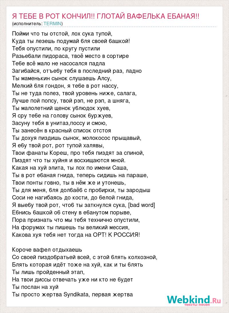 А как ты думаешь, о чем песня "Я ТЕБЕ В РОТ КОНЧИЛ!! ГЛОТАЙ ВАФЕЛЬКА ЕБАНАЯ!!" ?