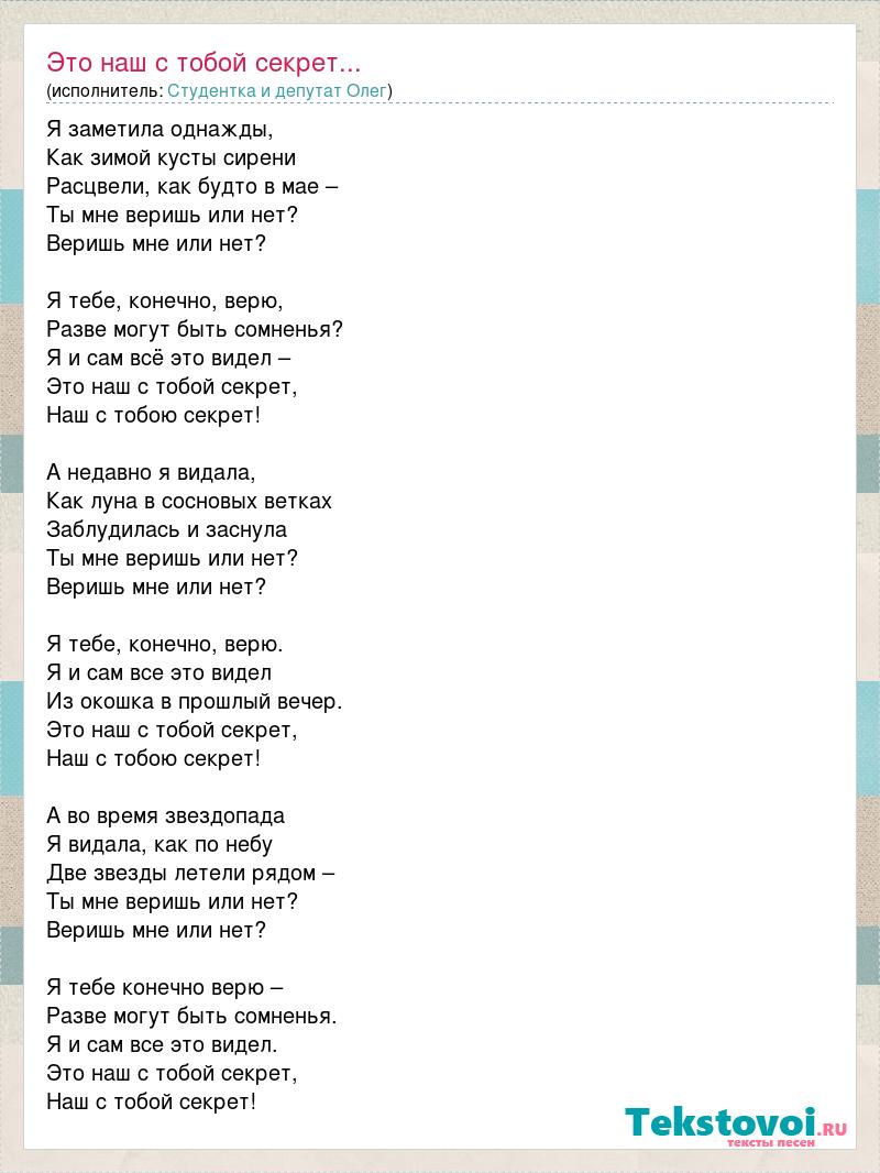 Я заметила однажды, Как зимой кусты сирени Расцвели, как будто в мае – Ты мне веришь или нет? Веришь мне или нет? Я тебе, конечно, верю, Разве могут быть сомненья? Я и сам всё это видел – Это наш с тобой секрет, Наш с тобою секрет! А недавно я видала, Как луна в сосновых ветках Заблудилась и заснула Ты мне веришь или нет? Веришь мне или нет? Я тебе, конечно, верю. Я и сам все это видел Из окошка в прошлый вечер. Это наш с тобой секрет, Наш с тобою секрет! А во время звездопада Я видала, как по небу Две звезды летели рядом – Ты мне веришь или нет? Веришь мне или нет? Я тебе конечно верю – Разве могут быть сомненья. Я и сам все это видел. Это наш с тобой секрет, Наш с тобой секрет!