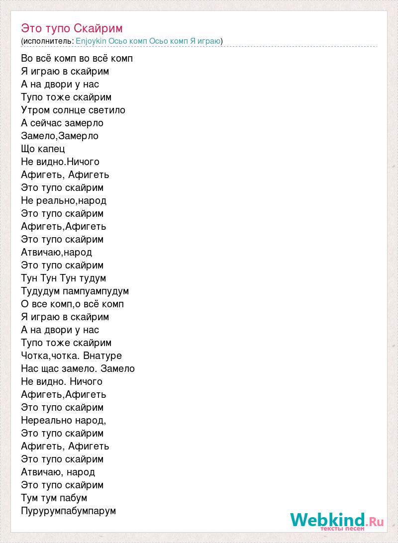 Во всё комп во всё комп Я играю в скайрим А на двори у нас Тупо тоже скайрим Утром солнце светило А сейчас замерло Замело,Замерло Що капец Не видно.Ничого Афигеть, Афигеть Это тупо скайрим Не реально,народ Это тупо скайрим Афигеть,Афигеть Это тупо скайрим Атвичаю,народ Это тупо скайрим Тун Тун Тун тудум Тудудум пампуампудум О все комп,о всё комп Я играю в скайрим А на двори у нас Тупо тоже скайрим Чотка,чотка. Внатуре Нас щас замело. Замело Не видно. Ничого Афигеть,Афигеть Это тупо скайрим Нереально народ, Это тупо скайрим Афигеть, Афигеть Это тупо скайрим Атвичаю, народ Это тупо скайрим Тум тум пабум Пурурумпабумпарум