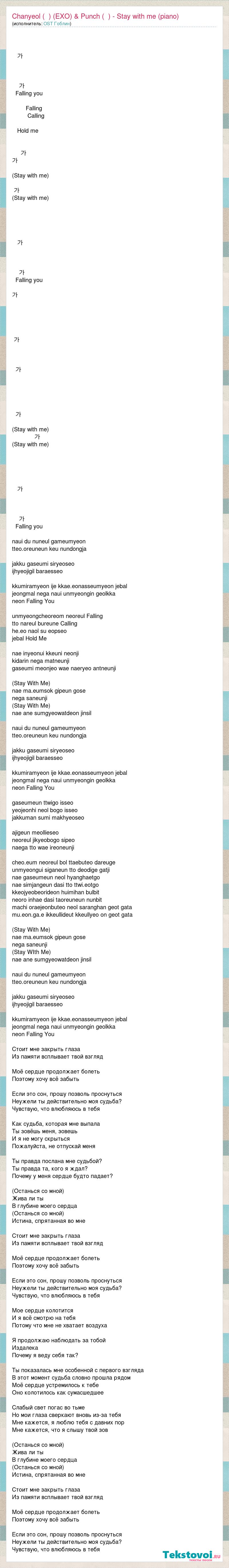 나의 두 눈을 감으면 떠오르는 그 눈동자 자꾸 가슴이 시려서 잊혀지길 바랬어 꿈이라면 이제 깨어났으면 제발 정말 네가 나의 운명인 걸까 넌 Falling you 운명처럼 너를 Falling 또 나를 부르네 Calling 헤어 나올 수 없어 제발 Hold me 내 인연의 끈이 넌지 기다린 네가 맞는지 가슴이 먼저 왜 내려앉는지 (Stay with me) 내 마음속 깊은 곳에 네가 사는지 (Stay with me) 내 안에 숨겨왔던 진실 나의 두 눈을 감으면 떠오르는 그 눈동자 자꾸 가슴이 시려서 잊혀지길 바랬어 꿈이라면 이제 깨어났으면 제발 정말 네가 나의 운명인 걸까 넌 Falling you 가슴은 뛰고 있어 여전히 널 보고 있어 자꾸만 숨이 막혀서 아직은 멀리에서 너를 지켜보고 싶어 내가 또 왜 이러는지 처음 너를 볼 때부터 다르게 운명의 시간은 또 더디게 갔지 내 가슴은 널 향했고 내 심장은 다시 또 뛰었고 꺼져버리던 희미한 불빛 너로 인해 다시 타오르는 눈빛 마치 오래전부터 널 사랑한 것 같아 무언가에 이끌리듯 끌려온 것 같아 (Stay with me) 내 마음속 깊은 곳에 네가 사는지 (Stay with me) 내 안에 숨겨왔던 진실 나의 두 눈을 감으면 떠오르는 그 눈동자 자꾸 가슴이 시려서 잊혀지길 바랬어 꿈이라면 이제 깨어났으면 제발 정말 네가 나의 운명인걸까 넌 Falling you naui du nuneul gameumyeon tteo.oreuneun keu nundongja jakku gaseumi siryeoseo ijhyeojigil baraesseo kkumiramyeon ije kkae.eonasseumyeon jebal jeongmal nega naui unmyeongin geolkka neon Falling You unmyeongcheoreom neoreul Falling tto nareul bureune Calling he.eo naol su eopseo jebal Hold Me nae inyeonui kkeuni neonji kidarin nega matneunji gaseumi meonjeo wae naeryeo antneunji (Stay With Me) nae ma.eumsok gipeun gose nega saneunji (Stay With Me) nae ane sumgyeowatdeon jinsil naui du nuneul gameumyeon tteo.oreuneun keu nundongja jakku gaseumi siryeoseo ijhyeojigil baraesseo kkumiramyeon ije kkae.eonasseumyeon jebal jeongmal nega naui unmyeongin geolkka neon Falling You gaseumeun ttwigo isseo yeojeonhi neol bogo isseo jakkuman sumi makhyeoseo ajigeun meollieseo neoreul jikyeobogo sipeo naega tto wae ireoneunji cheo.eum neoreul bol ttaebuteo dareuge unmyeongui siganeun tto deodige gatji nae gaseumeun neol hyanghaetgo nae simjangeun dasi tto ttwi.eotgo kkeojyeobeorideon huimihan bulbit neoro inhae dasi taoreuneun nunbit machi oraejeonbuteo neol saranghan geot gata mu.eon.ga.e ikkeullideut kkeullyeo on geot gata (Stay With Me) nae ma.eumsok gipeun gose nega saneunji (Stay WIth Me) nae ane sumgyeowatdeon jinsil naui du nuneul gameumyeon tteo.oreuneun keu nundongja jakku gaseumi siryeoseo ijhyeojigil baraesseo kkumiramyeon ije kkae.eonasseumyeon jebal jeongmal nega naui unmyeongin geolkka neon Falling You Cтоит мне закрыть глаза Из памяти всплывает твой взгляд Моё сердце продолжает болеть Поэтому хочу всё забыть Если это сон, прошу позволь проснуться Неужели ты действительно моя судьба? Чувствую, что влюбляюсь в тебя Как судьба, которая мне выпала Ты зовёшь меня, зовешь И я не могу скрыться Пожалуйста, не отпускай меня Ты правда послана мне судьбой? Ты правда та, кого я ждал? Почему у меня сердце будто падает? (Останься со мной) Жива ли ты В глубине моего сердца (Останься со мной) Истина, спрятанная во мне Cтоит мне закрыть глаза Из памяти всплывает твой взгляд Моё сердце продолжает болеть Поэтому хочу всё забыть Если это сон, прошу позволь проснуться Неужели ты действительно моя судьба? Чувствую, что влюбляюсь в тебя Мое сердце колотится И я всё смотрю на тебя Потому что мне не хватает воздуха Я продолжаю наблюдать за тобой Издалека Почему я веду себя так? Ты показалась мне особенной с первого взгляда В этот момент судьба словно прошла рядом Моё сердце устремилось к тебе Оно колотилось как сумасшедшее Слабый свет погас во тьме Но мои глаза сверкают вновь из-за тебя Мне кажется, я люблю тебя с давних пор Мне кажется, что я слышу твой зов (Останься со мной) Жива ли ты В глубине моего сердца (Останься со мной) Истина, спрятанная во мне Cтоит мне закрыть глаза Из памяти всплывает твой взгляд Моё сердце продолжает болеть Поэтому хочу всё забыть Если это сон, прошу позволь проснуться Неужели ты действительно моя судьба? Чувствую, что влюбляюсь в тебя