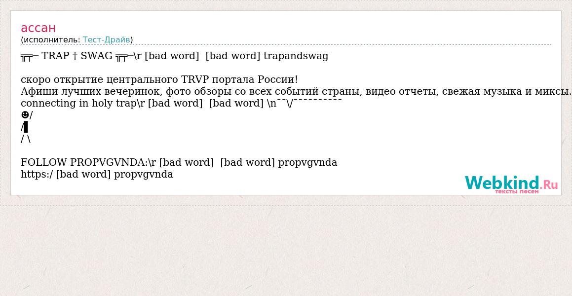 ︻╦╤─ TRAP † SWAG ︻╦╤─\r [bad word] [bad word] trapandswag скоро открытие центрального TRVP портала России! Афиши лучших вечеринок, фото обзоры со всех событий страны, видео отчеты, свежая музыка и миксы. connecting in holy trap\r [bad word] [bad word] \n¯¯\/¯¯¯¯¯¯¯¯¯¯ ☻/ /▌ / \ FOLLOW PROPVGVNDA:\r [bad word] [bad word] propvgvnda https:/ [bad word] propvgvnda
